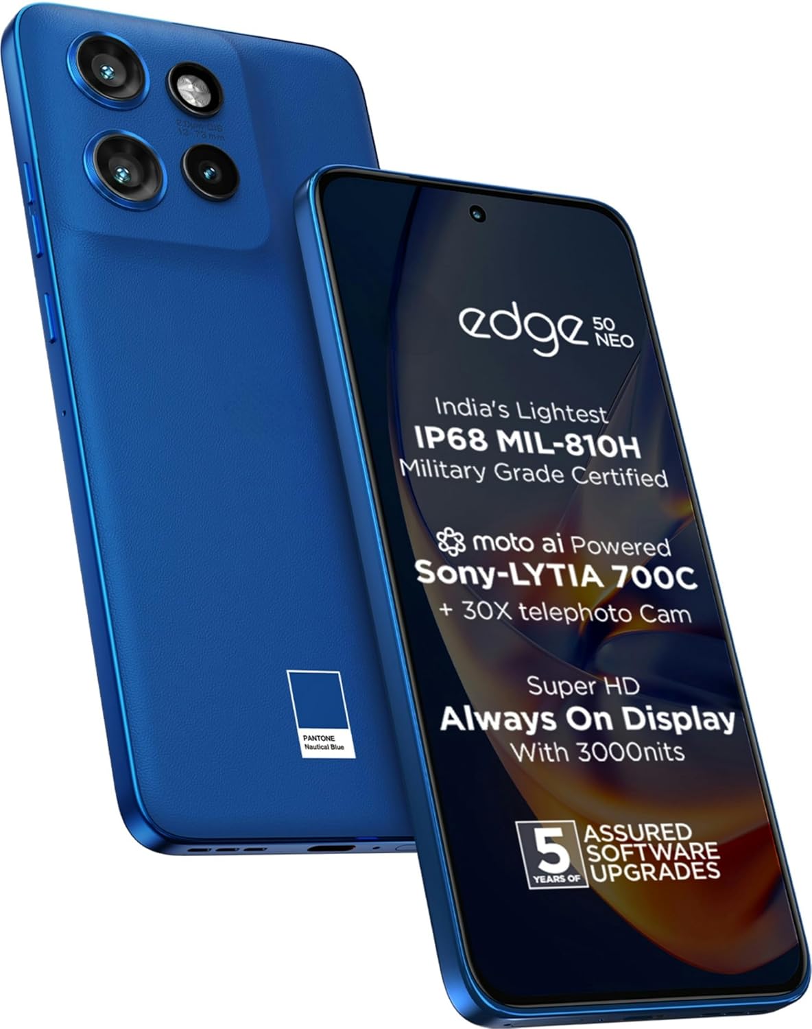 Motorola Edge 50 Neo 5G (Nautical Blue, 8GB RAM, 256GB Storage) | 6.4″ pOLED 120Hz Display | 50MP OIS Triple Camera | Dimensity 7300 Processor | 4310mAh Battery | 68W Turbo Charging | IP68 Certified