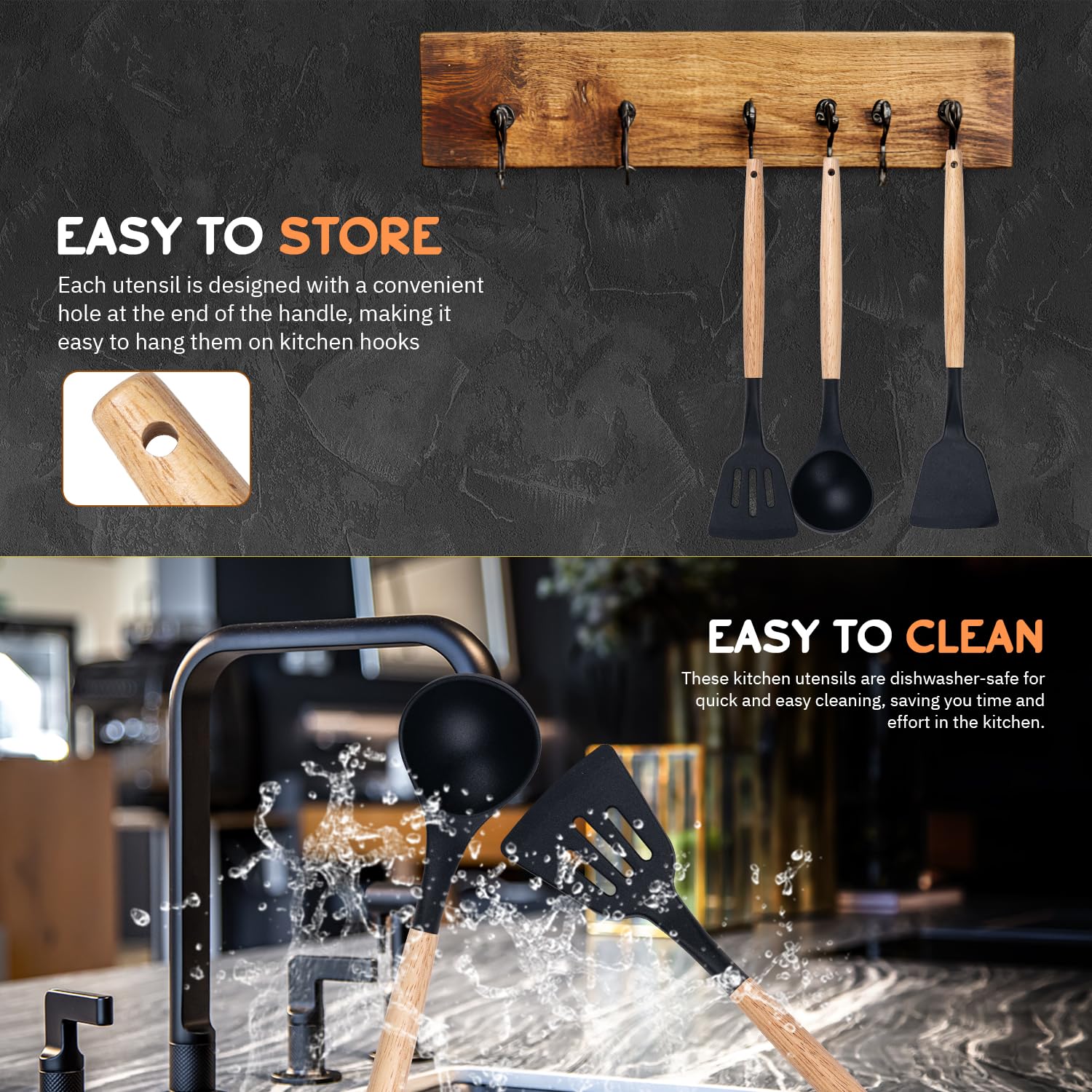 Modern & Chic – The earthy-looking acacia wood handles add a touch of elegance to your cooking tools. This nonstick set looks fantastic when hung in your kitchen.
