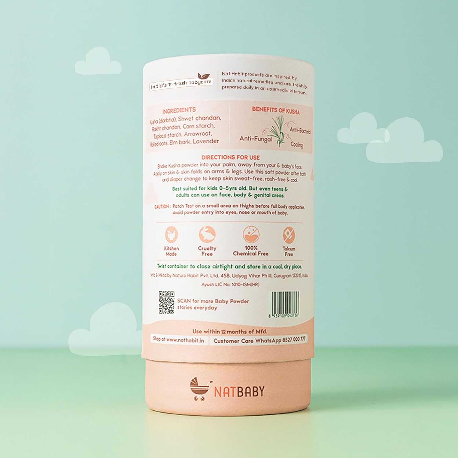How to Use: Shake Kusha powder into your palm, away from your & baby’s face. Apply on skin & skin folds on arms & legs. Use this soft powder after bath and diaper change to keep skin sweat-free, rash-free & cool. Best suited for kids 0-5yrs old. But even older kids, teens & adults can use it on the face, body & genital areas.