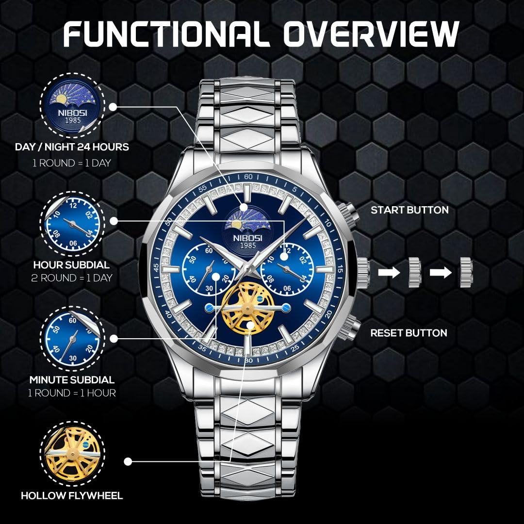The Nibosi Chronograph Watch is a true masterpiece that brings together elegance, precision, and innovative design, making it the ultimate gift for the modern man. With its sophisticated chronograph features, day and night subdial, and eye-catching hollow flywheel, this watch is designed to stand out on every wrist. Whether you’re gifting it to someone special or adding it to your collection, the Nibosi watch effortlessly blends form with function, offering a versatile accessory for any occasion. Plus, with a 1-year warranty, you can trust in its durability and craftsmanship.