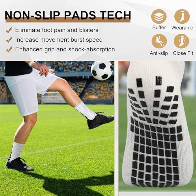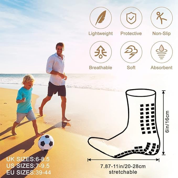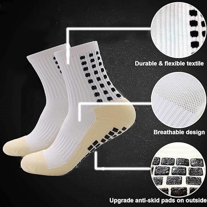 The Non Slip Grip Sports Socks are specially designed to improve stability, comfort, and performance during sports and physical activities. These high-performance athletic socks feature a unique anti-slip grip technology that helps prevent slipping inside shoes, providing better control, balance, and support. The socks are equipped with silicone grip pads on the sole, which create strong traction between the foot and the shoe. This feature is particularly useful for sports like football, basketball, running, gym workouts, yoga, and other high-intensity activities where stability and quick movements are important. Made from breathable and stretchable fabric, these socks provide excellent ventilation to keep your feet dry and comfortable throughout the day. The moisture-wicking material helps absorb sweat and reduce odor, making them ideal for long training sessions or sports competitions. The compression design offers extra support to the arch and ankle, helping reduce fatigue during intense physical activities. This support improves blood circulation and provides a comfortable snug fit without feeling too tight. These sports socks also feature reinforced cushioning at the heel and toe areas, which helps absorb impact and protect your feet during running, jumping, and training. The cushioned support enhances comfort while reducing pressure on the feet. The long athletic sock design provides additional ankle and calf coverage, making them suitable for football players, athletes, gym enthusiasts, and fitness lovers. The socks stay securely in place without sliding down during activity. These versatile grip socks can be used for many activities including football, soccer, basketball, running, gym workouts, cycling, yoga, hiking, and daily sports training. Whether you are a professional athlete or a fitness enthusiast, these Non Slip Grip Sports Socks help improve performance, enhance comfort, and provide better stability during movement.
