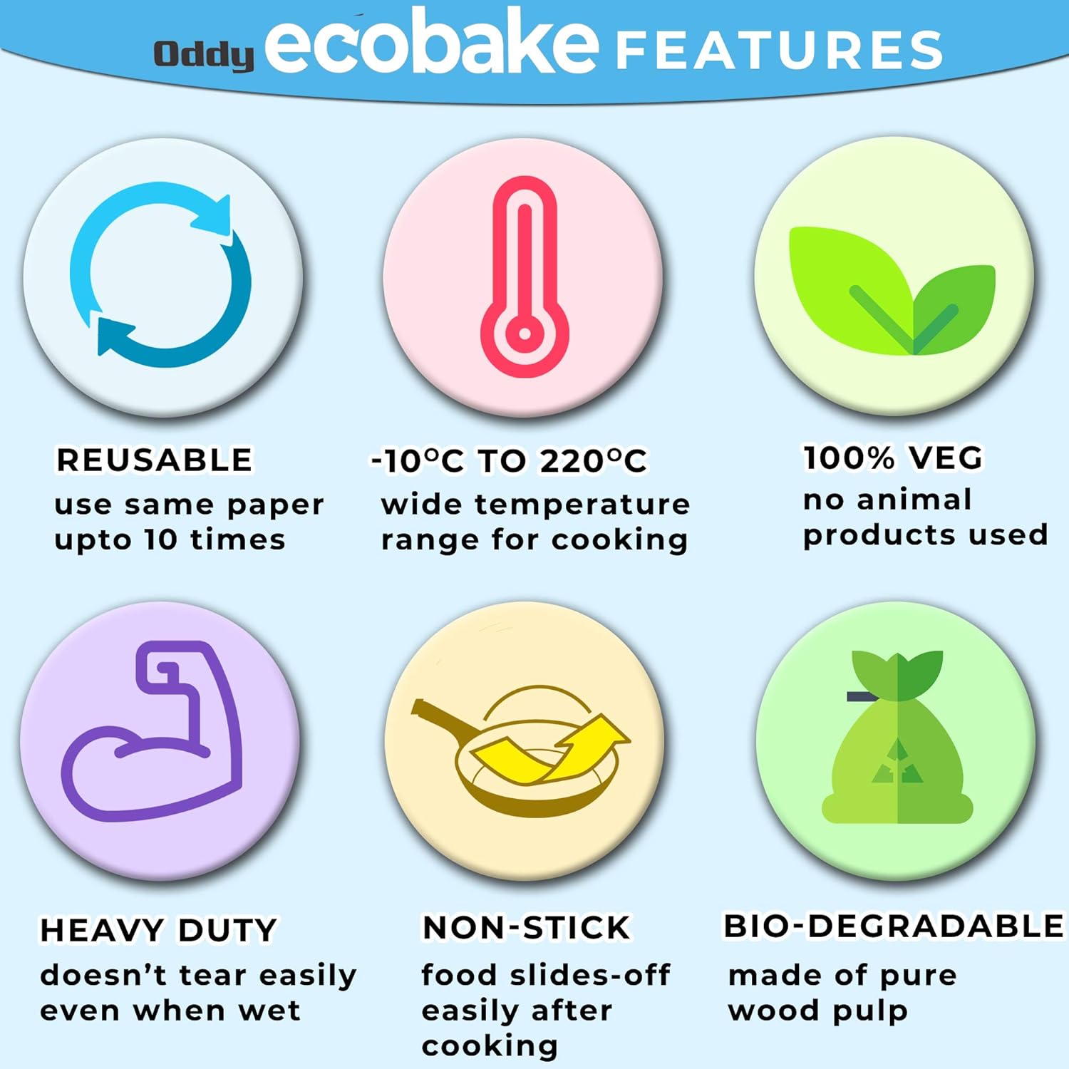 Oddy Ecobake Baking and Cooking paper. Whether you are baking cookies or cakes, or anything else, use of parchment paper is a must! Oddy Ecobake provides Baking & Cooking Parchment Paper which is ideal for use upto 230 deg C and can even be re-used multiple times! It eliminates the need for greasing the baking tray and there is no need for cleanup of the tray. Also, the shape of the product is perfect as the baked item doesn’t stick to the pan. Note: It is normal for paper to turn brown after baking.