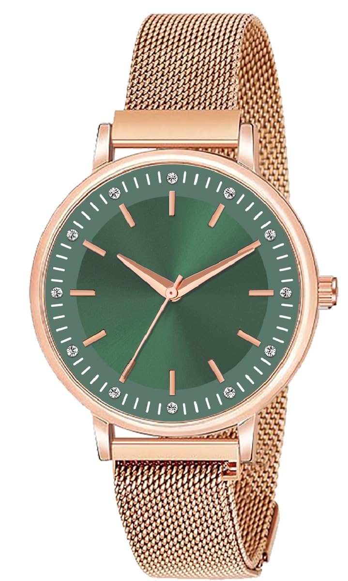 Elevate your style with this exquisite timepiece that exudes sophistication and timeless elegance. Crafted with meticulous attention to detail, this watch features a sleek rose gold-toned case that seamlessly blends with the intricately woven mesh bracelet, creating a harmonious and eye-catching ensemble. The blue dial, adorned with diamond indices, adds a touch of understated luxury, while the slender rose gold-toned hands gracefully sweep across its surface. Whether you’re dressing up for a formal occasion or simply seeking a refined accessory for everyday wear, this watch is a perfect companion that effortlessly complements any ensemble. With its impeccable craftsmanship and contemporary design, it is a testament to enduring style and quality.