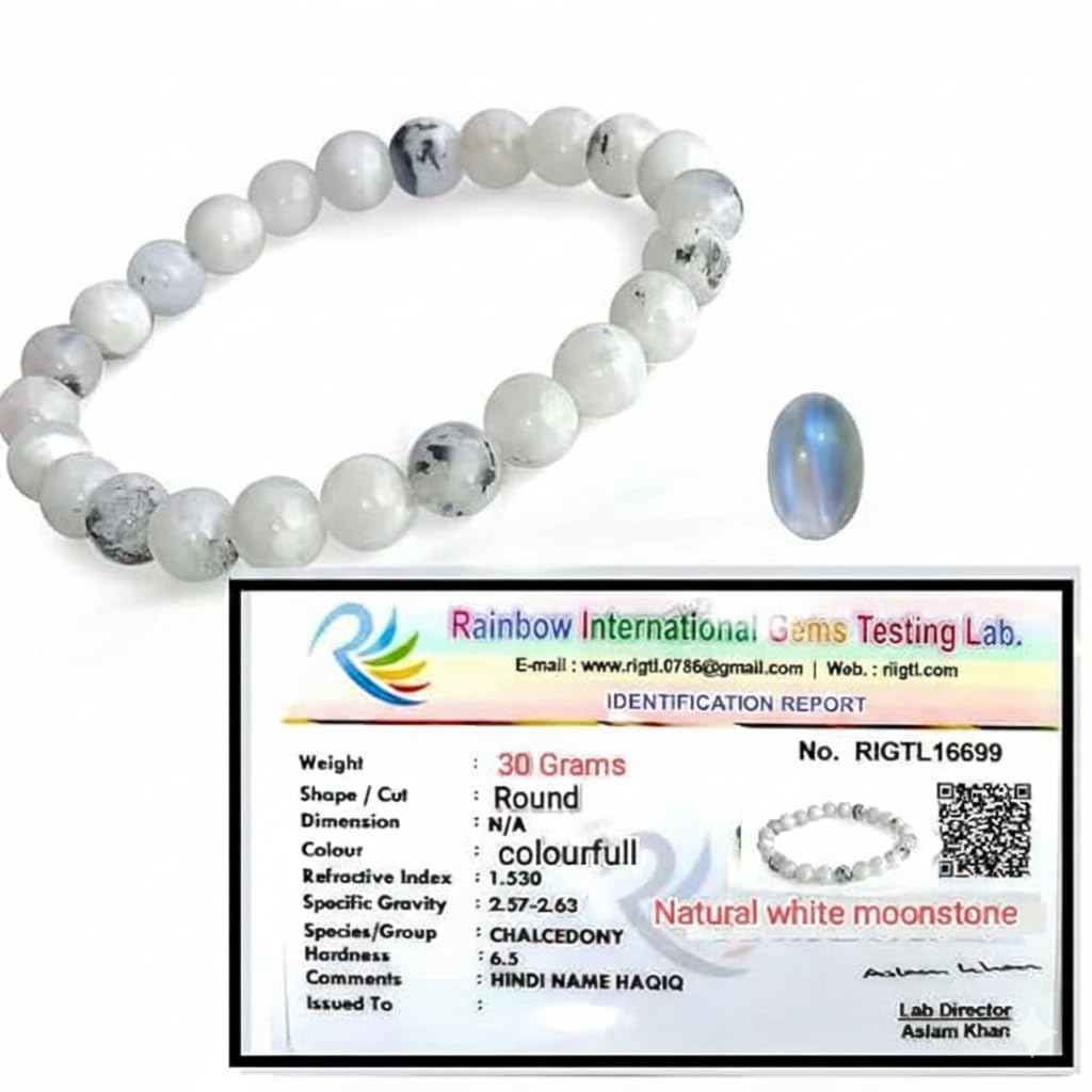 The Moonstone Bracelet is a symbol of peace, positivity, and inspiration. It is prepared from the original moonstone raw crystal. This crystal bracelet attracts love and spirituality. The Moonstone bracelet is filled with calming and soothing energies. It helps in attracting better sleep and meaningful dreams and supporting psychic vision. White Moonstone bracelet is called the state of the new moon as it helps with new beginnings and change. People born under the Libra zodiac sign can benefit greatly from this bracelet but it can be worn by anyone of any rashi, zodiac sign or nakshatra. Moonstone crystal bracelet brings good fortune and happiness. Moonstone bracelet is lightweight, stretchable, and comfortable to wear. Wearing this bracelet can help attract peace and positivity. It promotes a new start and enhances psychic abilities and inspiration. Moonstone bracelet promotes emotional healing by calming strong emotions and helping balance hormonal cycles in women. The moon bracelet is a couple bracelet, girl bracelet, boys bracelet, men’s bracelet, and women bracelet means can be worn by anyone and it gives a sense of spirituality and intuition. Moonstone bracelets are associated with calming energies so people keep them under their pillow or near bed to promote restful sleep and reduce nightmares. This moon crystal bracelet balances emotional instability, anger, stress, and hormonal imbalance. It is highly recommended to wear this bracelet to attract peace, positivity, spiritual growth and psychic abilities.