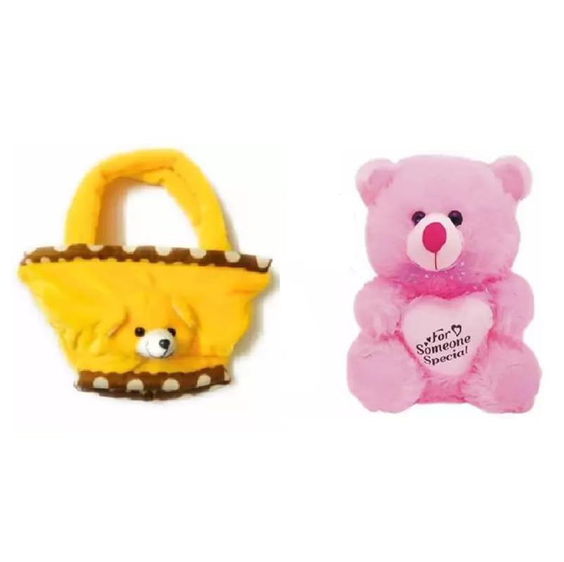 Pack of 2 Soft Toys – Pink Teddy Bear and Yellow Basket Style Plush for Kids | Unique Combo Gift for Baby Room, Celebration or Display Multi Color
