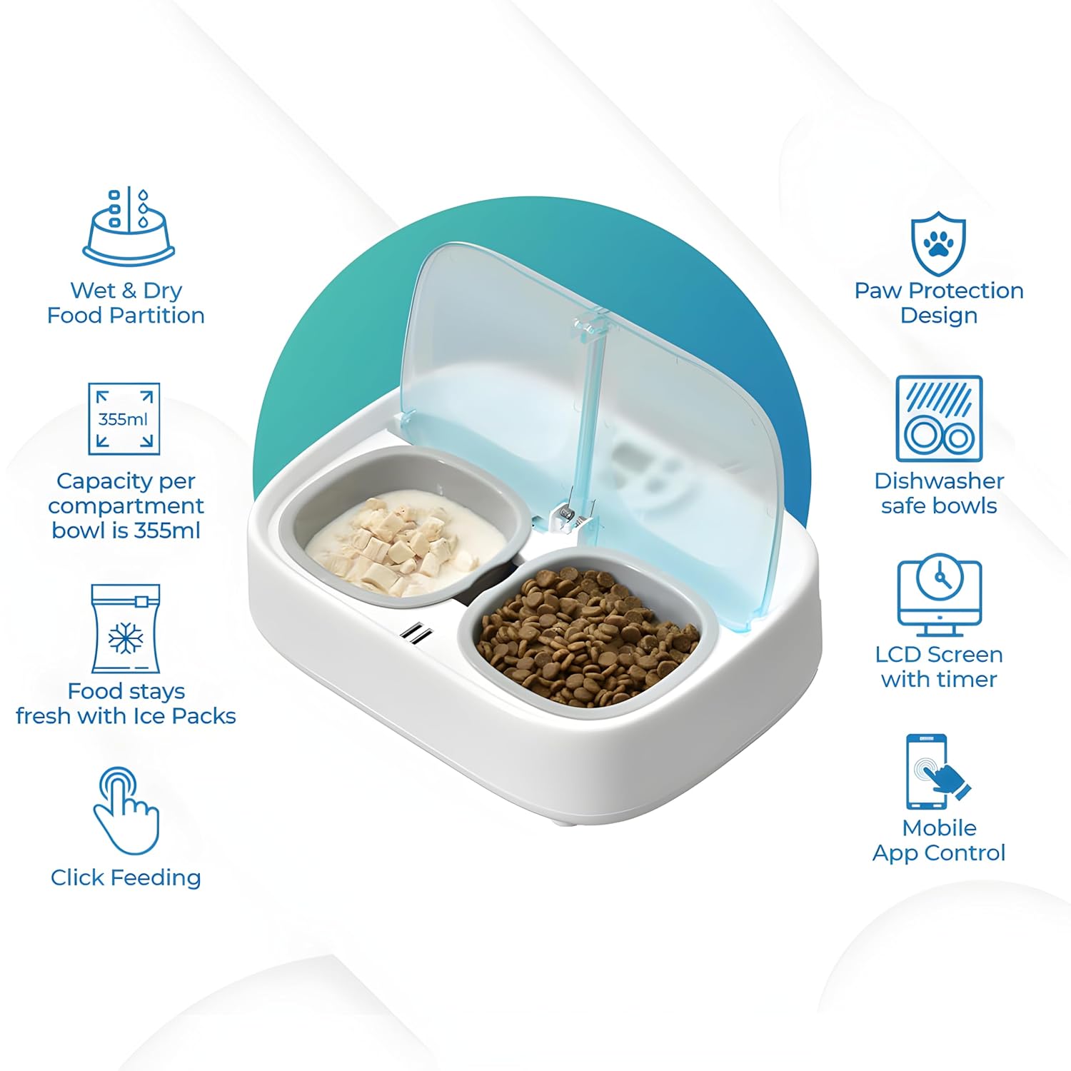 SMART MOBILE APP CONTROL via Bluetooth: The Baybot Pet Feeder lets you schedule meals remotely through app-based control. A perfect autofeeder and timed wet food feeder for modern pet parents. DUAL TRAYS for Wet & Dry Food with Ice Pack Support: Separate compartments for wet & dry food partition keep meals organized. Add ice packs below the tray to keep food cool and fresh — perfect for cat feeding bowls and dog food. LOW FOOD ALERT & CLICK FEEDING: Get notified with Red LED indication when food runs low. Use Click Feeding for instant meals — a smart time set dog food machine for busy schedules. PET-SAFE & Durable Design: Thoughtfully built with a paw protection design, double locked freshness with silicon, and non-slip base. An excellent fit for dog food stands and dog accessories for all dogs. EASY TO CLEAN & Precise Portions: Comes with two dishwasher safe bowls (each 355 ml) and an easy-to-use LCD screen with timer. Great cat bowl for Persian cat, Shihtzu dog feeding bowls medium, and even animal feed processing machine alternatives at home. Slow feeder for dogs. Automatic cat feeder. Cat food bowls. Cats accessories. Dog food stand. Shihtzu dog food stand. Dog bowls medium. Dog feeder automatic. Automatic wet food cat feeder.