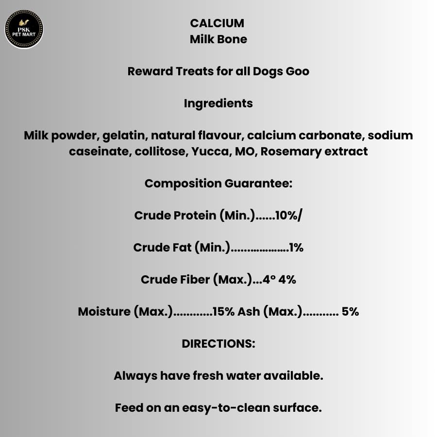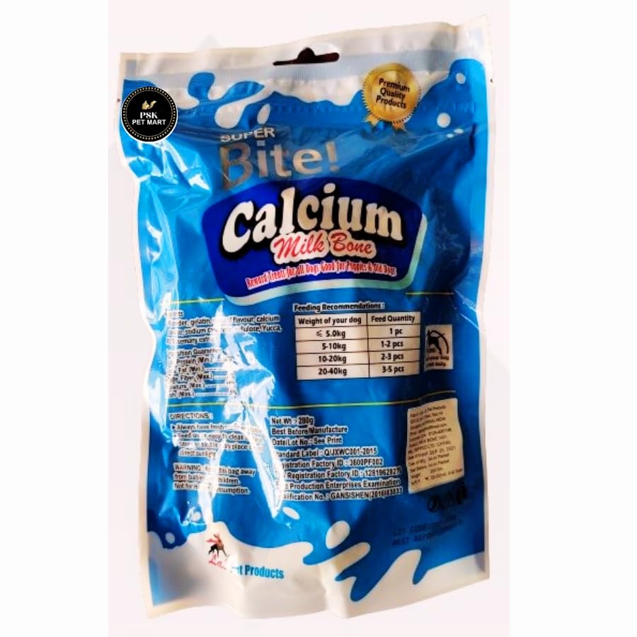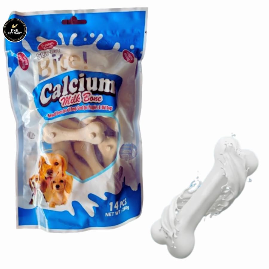 PSK PET MART calcium milk bone (280gm) it helps maintain strong bones and muscles, improves digestive problems and cleans teeth. Calcium milk bone, a safe outlet for your pup to express its tendency to chew. The protein abundant milk bones, when chewed, assist in rubbing off the tartar and plaque formation from the teeth and gums of the puppy, facilitating the incoming of fresh breath. Calcium contributes towards the health of bones and teeth of the dog. It is suitable for dogs of all breeds 2 months onwards.