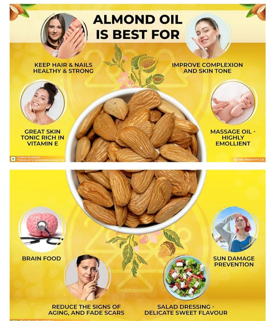 🌰 100% Pure wood Pressed Almond Oil:Made from premium quality almonds using a wood -press method that retains all essential nutrients, vitamins, and ensuring maximum health and beauty benefits.