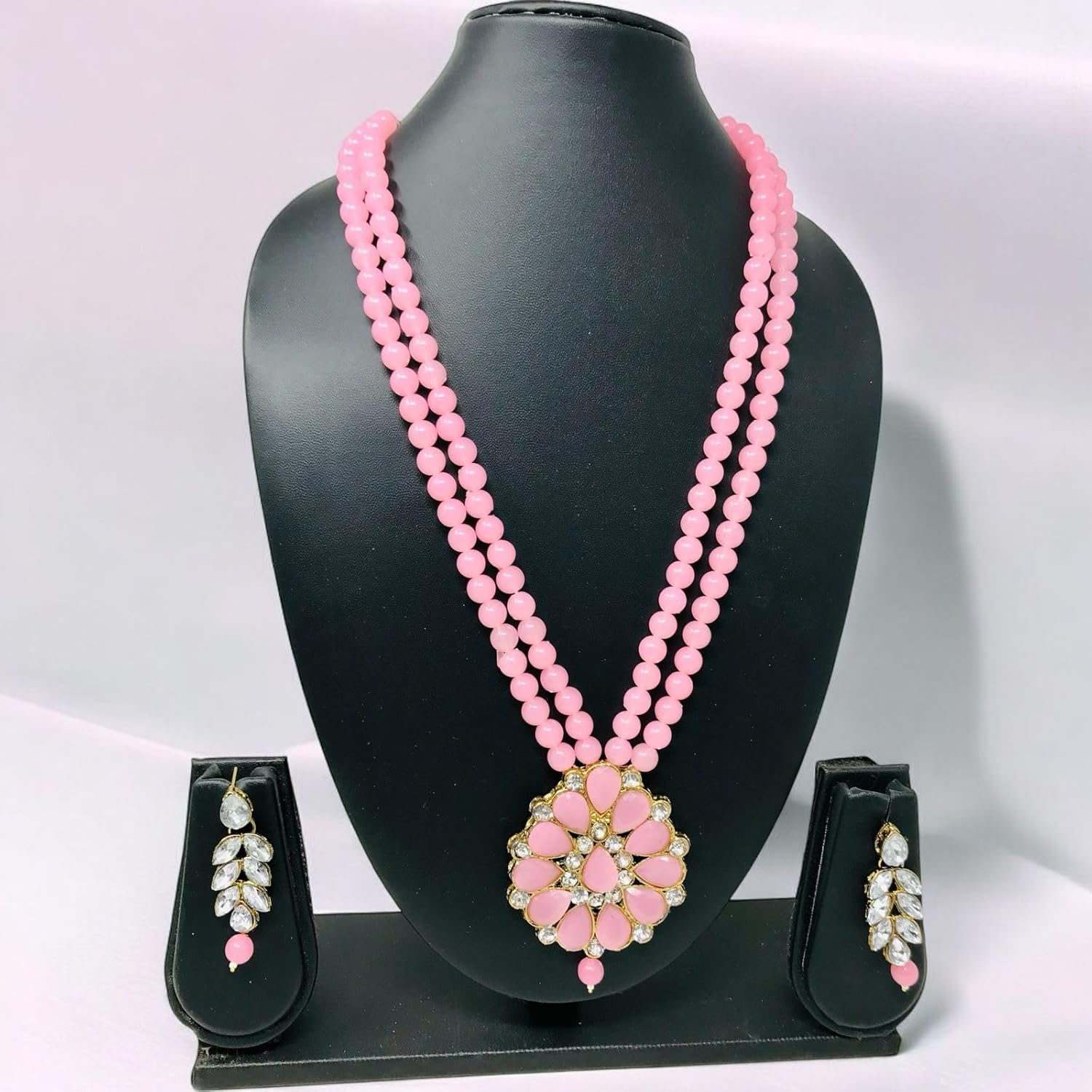 Add a touch of elegance and charm to your ethnic wardrobe with this Stylish Pink Beaded Necklace Set for Women and Girls. Featuring twin strands of soft pink beads and a striking floral pendant centerpiece, this long necklace set is the perfect blend of modern flair and traditional design. Paired with matching earrings, this jewelry set completes your festive, wedding, or party look effortlessly. Crafted with high-quality materials and fine craftsmanship, this traditional long necklace set is lightweight, skin-friendly, and designed to be worn comfortably for long hours. The eye-catching floral pendant adds a bold focal point, making it ideal for enhancing both casual ethnic wear and grand festive outfits like sarees, lehengas, and kurtis. Whether you’re dressing up for a festive celebration, a family function, or simply want to refresh your jewelry collection, this pink necklace set is a must-have. It also makes a thoughtful and beautiful gift for wife, sister, girlfriend, or mother on special occasions like birthdays, anniversaries, Raksha Bandhan, Karwa Chauth, and Diwali. This pink beaded ethnic jewelry set is versatile, elegant, and timeless—perfect for the modern woman who loves to stay rooted in tradition while embracing style.