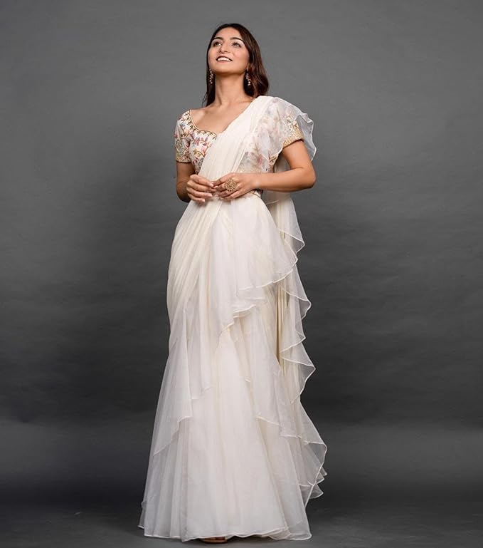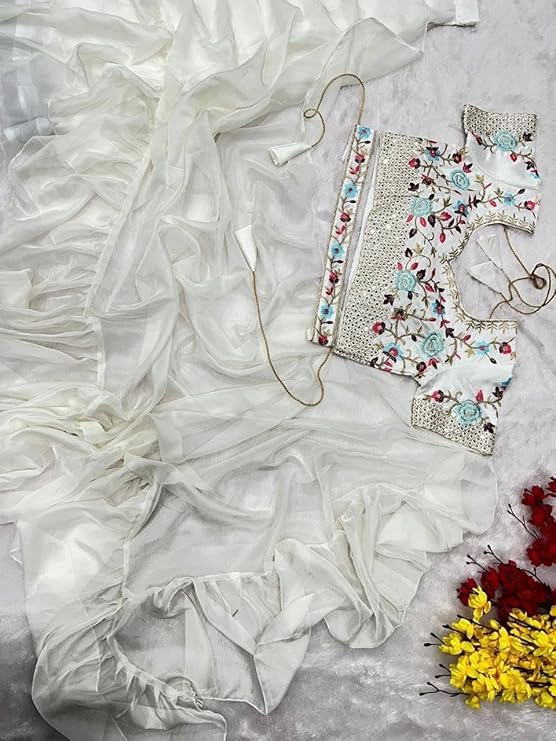 Ready To Wear Lehenga Saree & Belt Set For Women Bollywood Style Apple Organza Silk Fabric On Fully Stitched Blouse White Colour