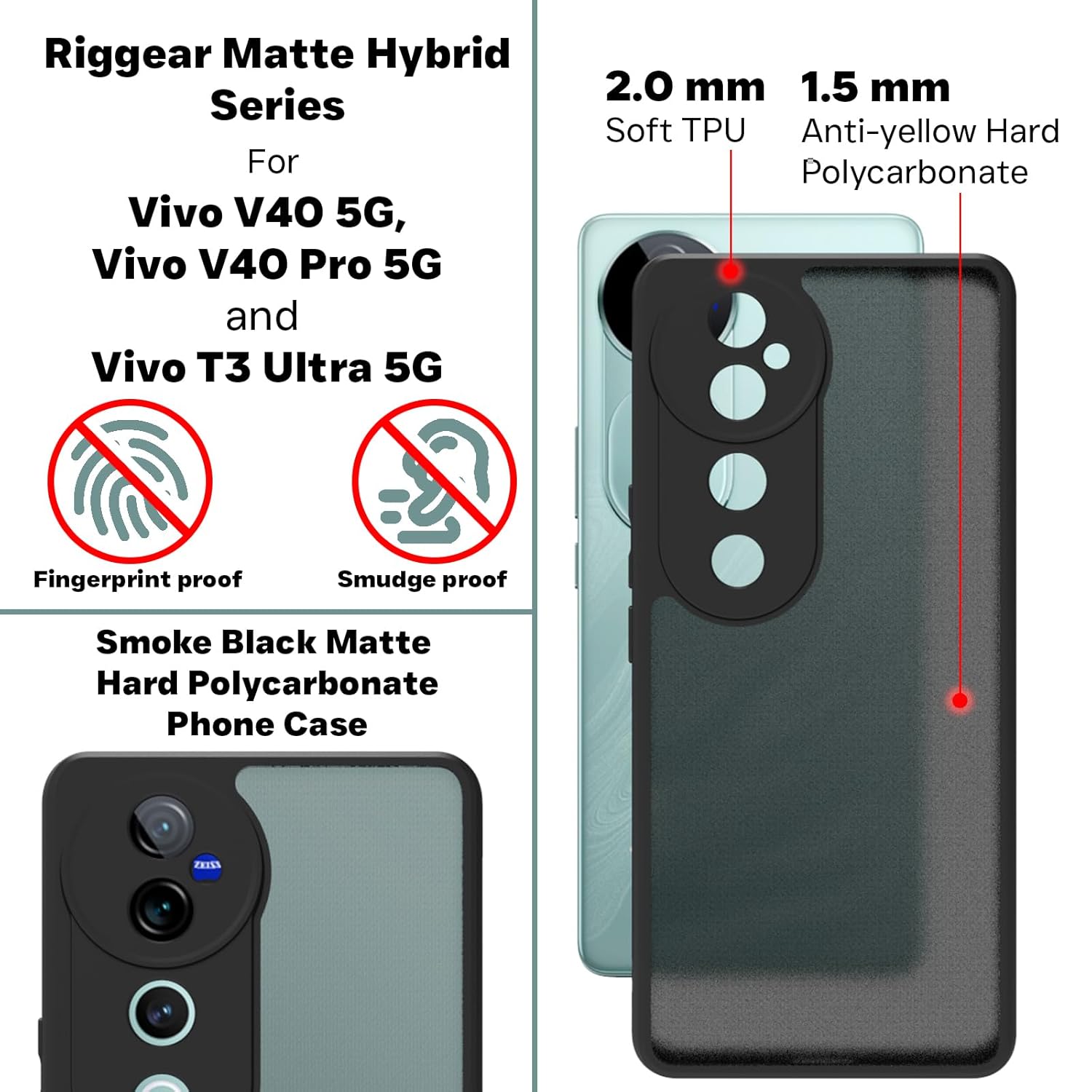 RIGGEAR Shockproof Sleek Hybrid Armor Back Cover Case Compatible with Vivo V40, Vivo V40 Pro 5G, Vivo T3 Ultra (Smoke Black Matte PC + Black TPU Bumper)