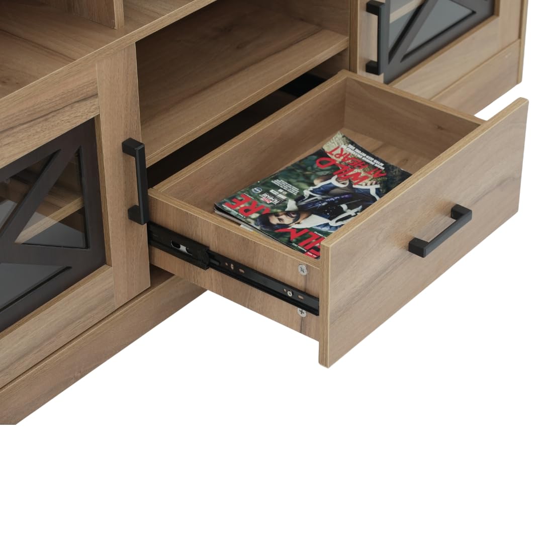 Glass Doors with Subtle Detailing: Framed with elegant X-designs, the glass-panel doors on this tv cabinet allows partial visibility while keeping things tidy. Soft closure hinges reduce impact sounds, enhancing the smooth operation of the tv unit.