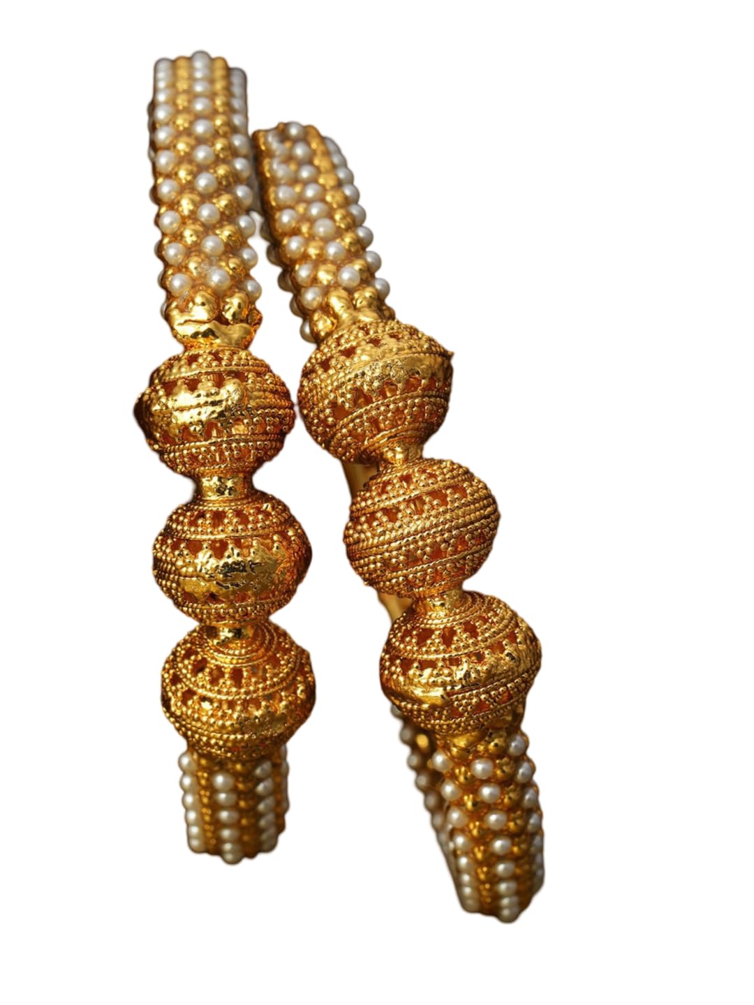 Double the Elegance: This set features two beautiful, handcrafted bangles adorned with white pearls. Handcrafted Charm: The bangles boast an artisanal quality, implying each piece may have slight variations due to the handcrafted nature. Classic Design: Each bangle features a simple, polished design with white pearls studded throughout the circumference. Pearls for Sophistication: The white pearls add a touch of sophistication and timeless elegance to the bangles. Perfect Gift & Suitable for Many Occasions: This set of bangles would be a lovely gift for someone who appreciates classic pearl jewelry or a stylish addition to your own collection. The versatile design complements both ethnic and western attire, making them suitable for a variety of occasions.