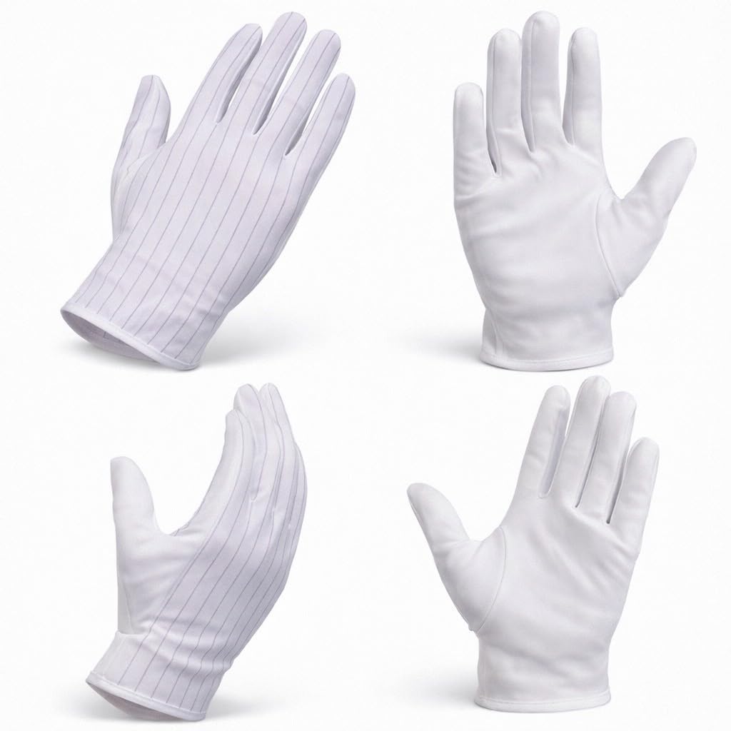 Surface Resistivity 1 x 10>6-8 Ω/cm. Type Dotted Hand Gloves Color White ESD Area Works Wearing these gloves are totally esd antisatic area work Material Made up of 92% Poyester + 8% carbon fiber & Fingertips PU coated