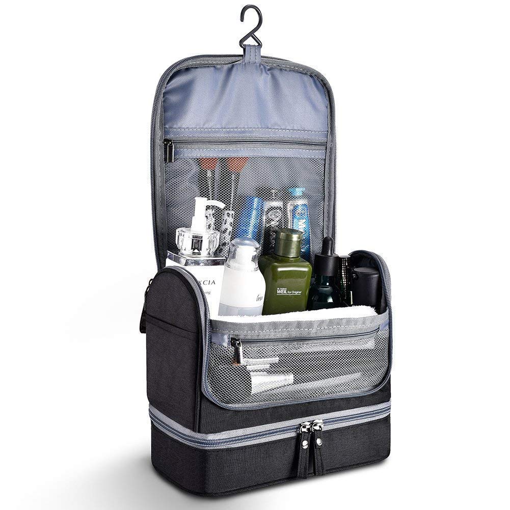 UNIQUE DESIGN FOR ADDED CONVENIENCE: The upper layer is for dry items, bottom layer is for wet ones. It enables you to easily separate wet from dry items, and you no longer have to worry about towels or accessories being soiled. You can also place cosmetics or other essentials that need to be stored separately here. Equipped with a large hook, you can also hang this toiletry kit bag in the washroom.
