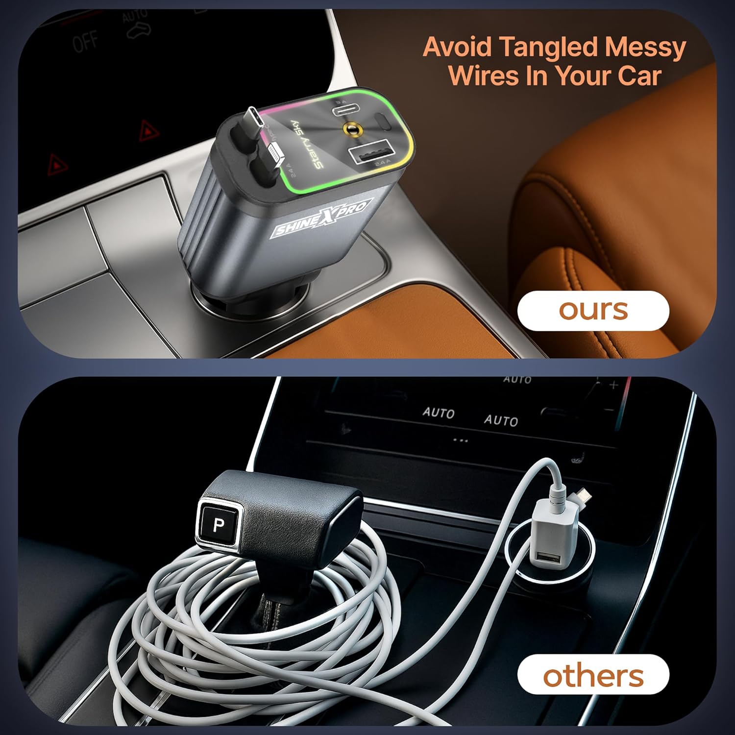 Retractable Design for Tangle-Free Use: The Starlight Retractable Car Charger features a built-in retractable cable that ensures a clutter-free car interior and offers convenient, tangle-free storage when not in use.