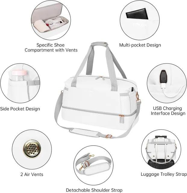 SHREESHANN Travel Duffel Bag with USB Charging Port,Weekender Overnight Bag with Wet Pocket and Shoes Compartment for Men & Women Multipurpose Use for Travel, Gym, Yoga(Pack of 1) (White)