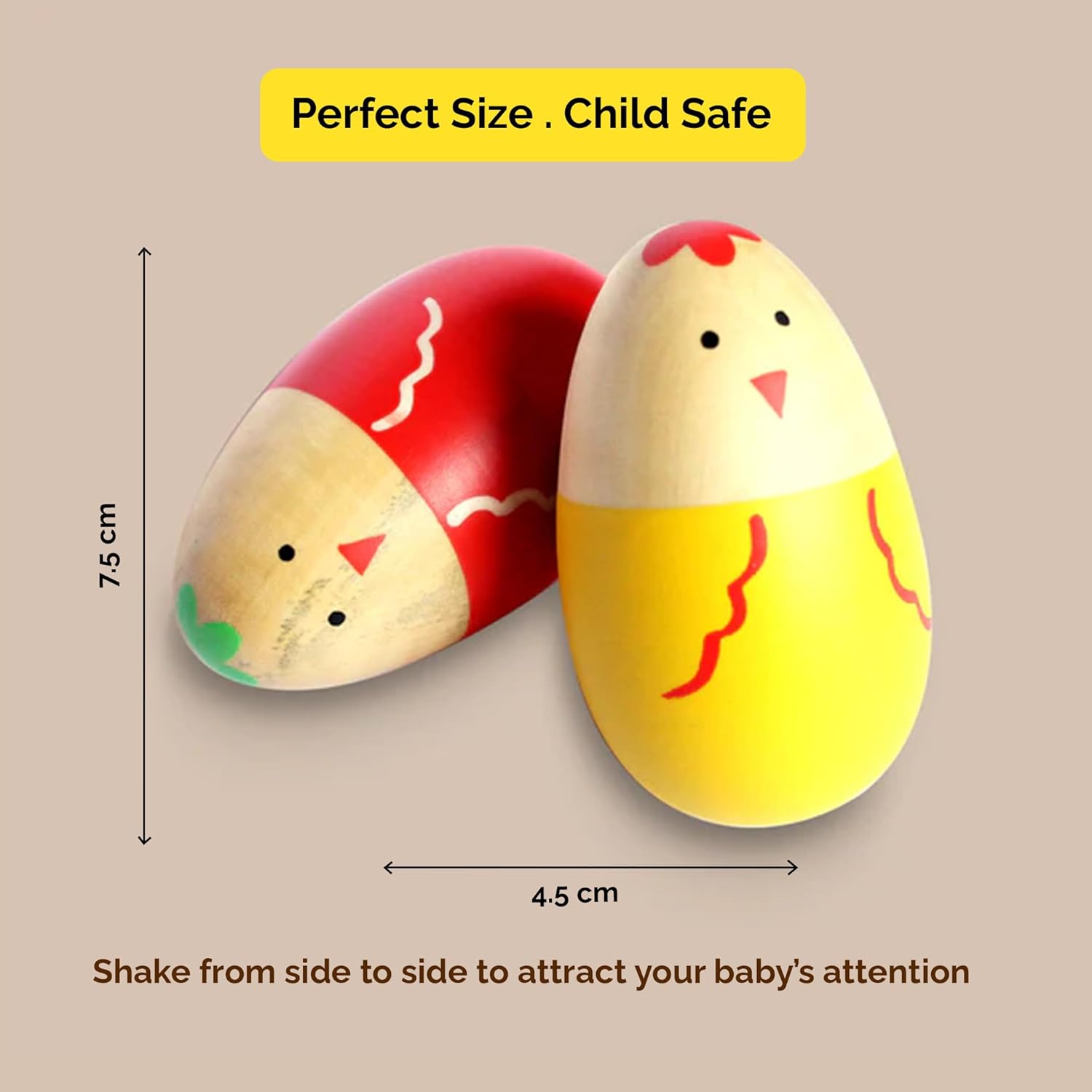 Natural Wooden Baby Toy : Handcrafted wooden rattles made using natural materials and polished with beeswax; painted using water-based colors; baby safe musical toy suitable for everyday play routines, nursery activities, and early learning environments.