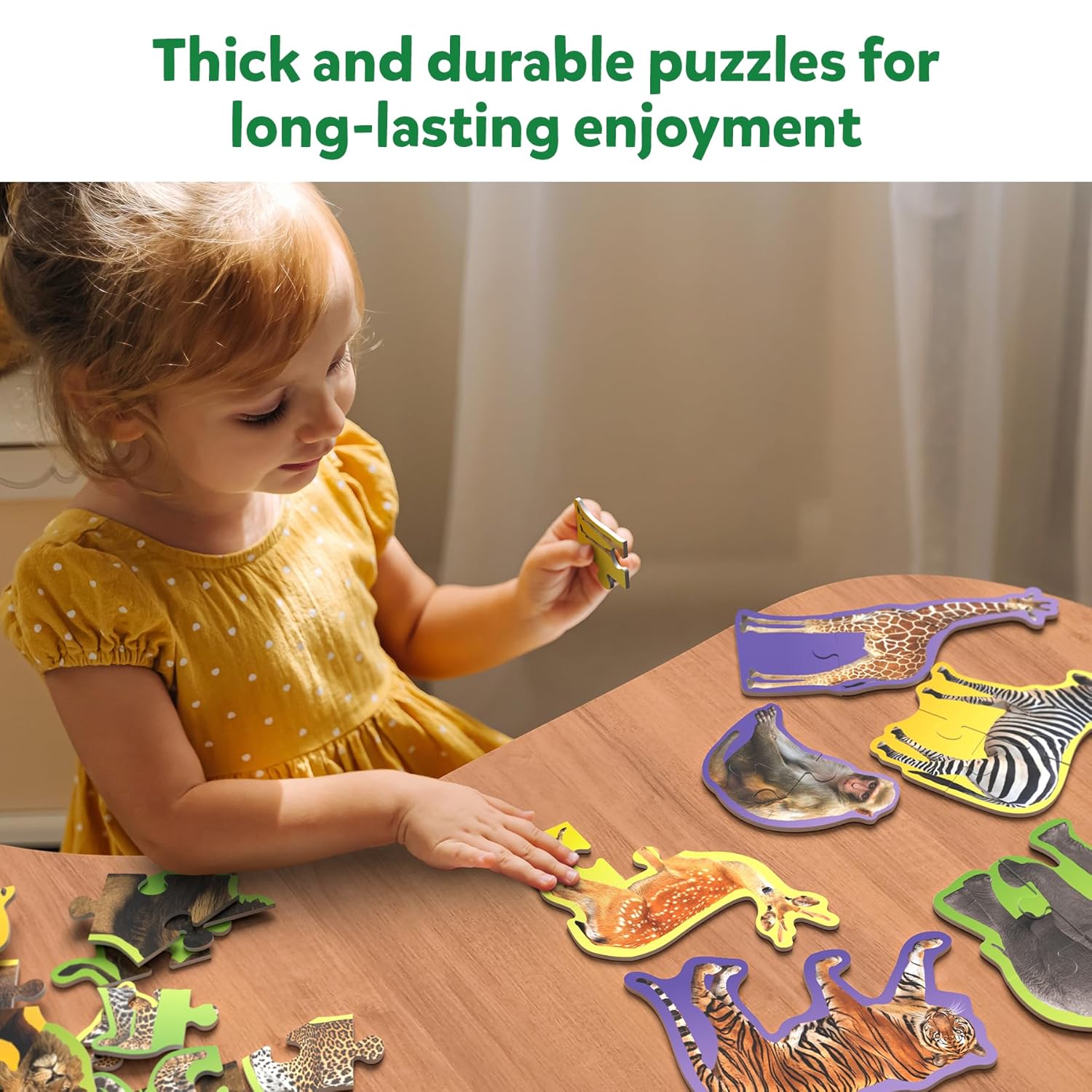 10 COLOUR-CODED PUZZLES: This set includes 10 colour-coded wild animal puzzles that progress in complexity. Start with the 3-piece puzzles and progressively work up to 4-piece and finally the 5-piece puzzles. Each type of puzzle is colour-coded so it’s easy to sort. As young children master their puzzling skills, they’ll learn about wild animals and build confidence along the way.