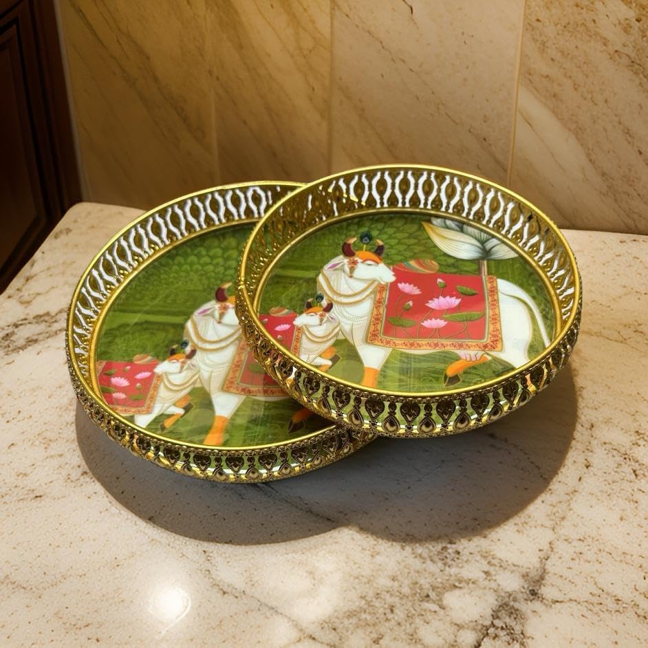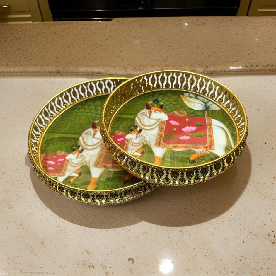 SKY HANDICRAFTS – Set of 2 Cow Pichwai | Best for Home Decor, Wedding Gift, Diwali Gift and Multiuse | Cow Printed Gift Hamper Basket | Tray with gold plating