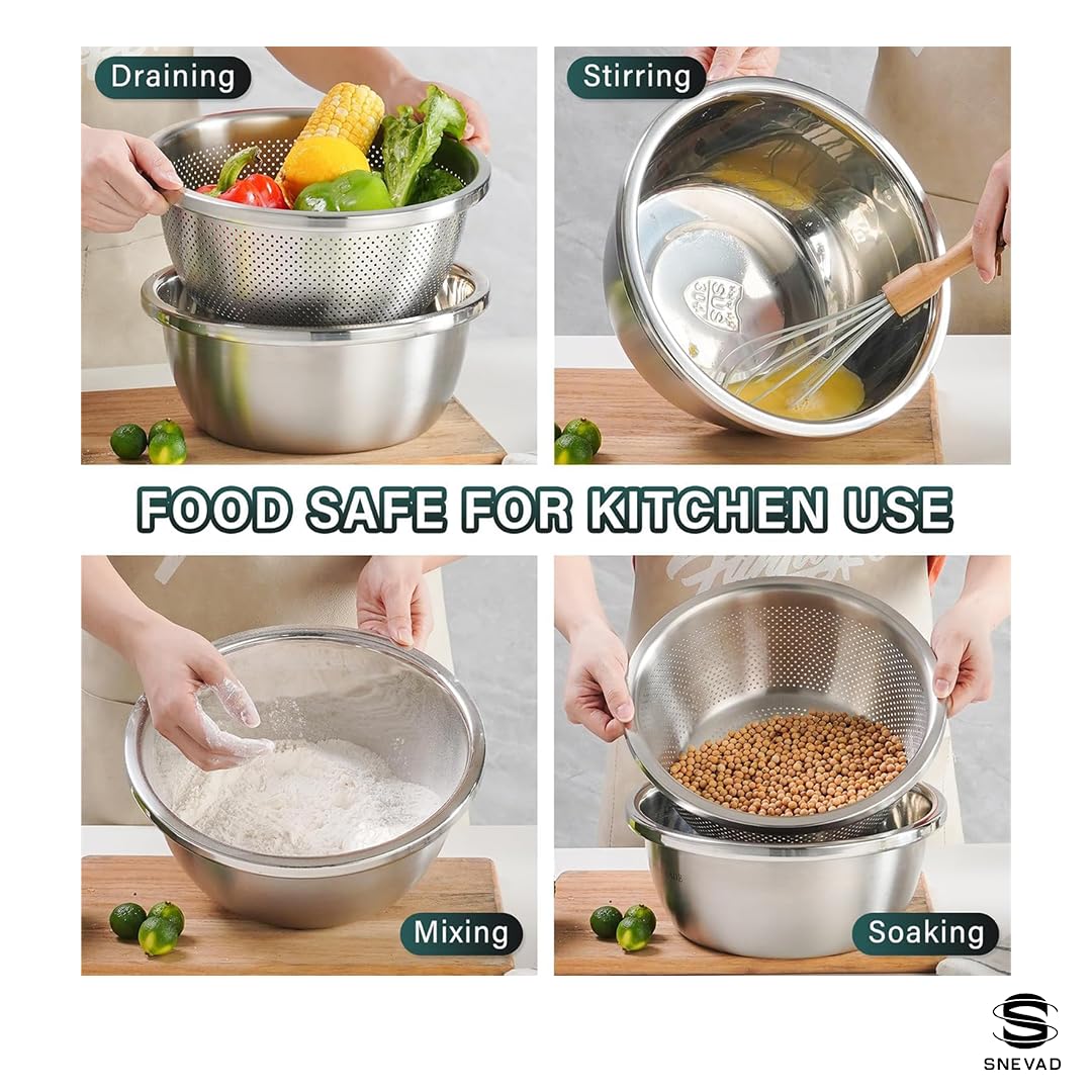 • 2 in 1 Colander Bowl Set This mixing bowl and colander set offers ample space for all your rinsing, washing, and draining needs Premium Material The Colander with Mixing Bowl is made of food grade stainless steel material, which is stable, and easy to clean.