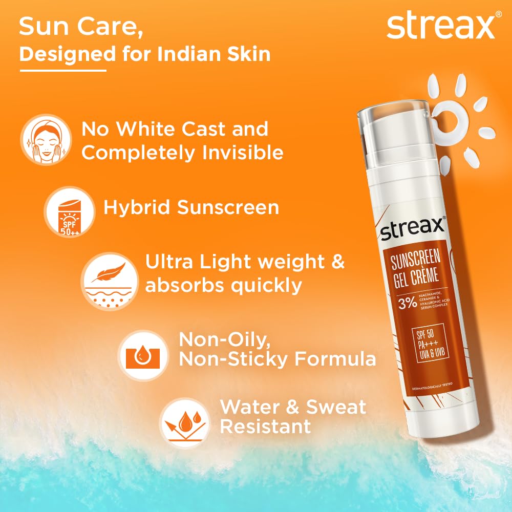 Streax Sunscreen Gel Crème SPF 50 PA+++, 50g | 3% Niacinamide | Serum Infused Sunscreen | Non-Oily, No White Cast | Hydrating & Brightening