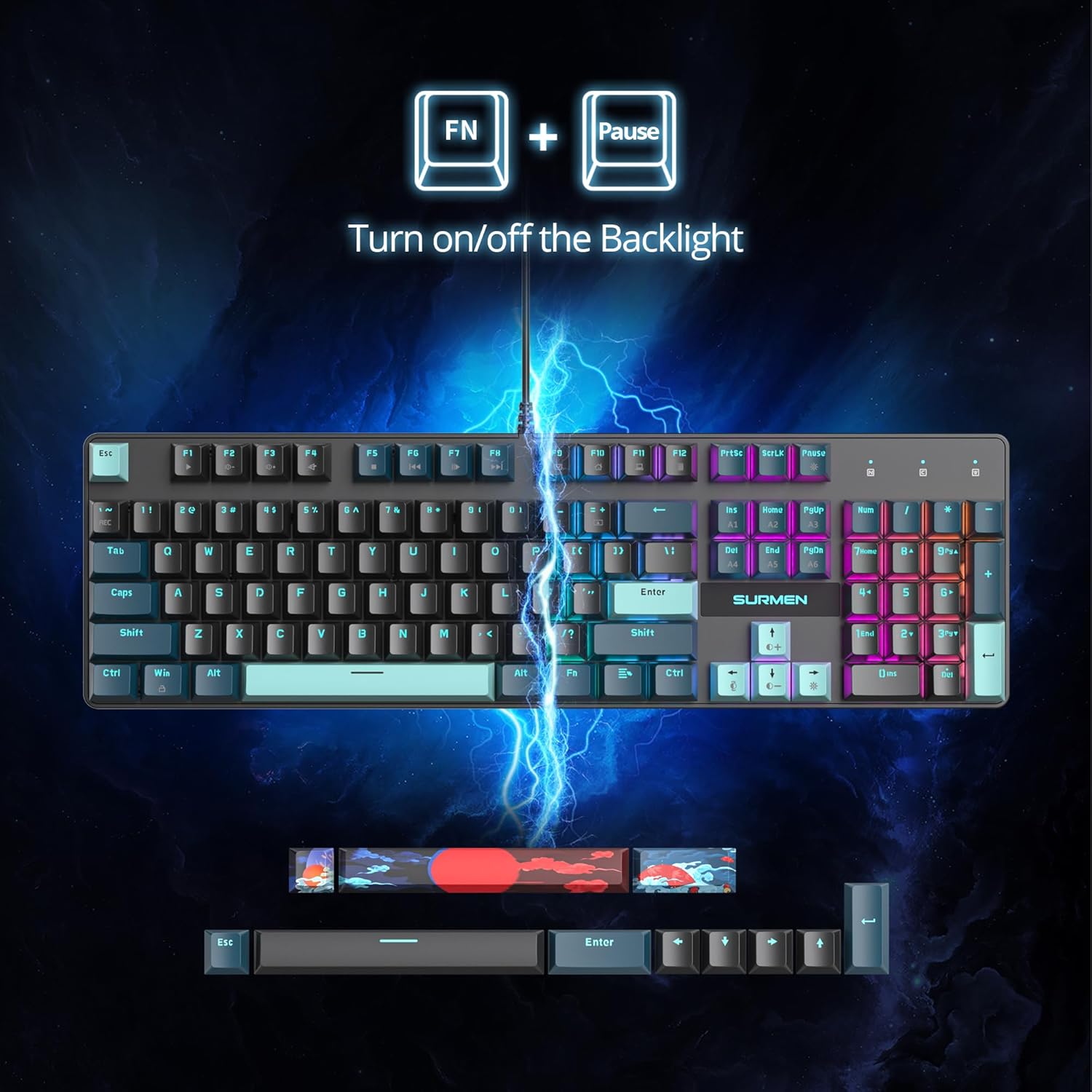 【Illuminate Your Desktop with Dynamic】:Illuminate your gaming sessions with the SURMEN V200 fullsize mechanical keyboard, featuring dazzling RGB backlighting. With 18 RGB backlight modes, you will create the perfect ambiance to enhance your gaming experience. And for those times when you prefer a more subdued environment, the lighting can be easily turned off at your convenience.