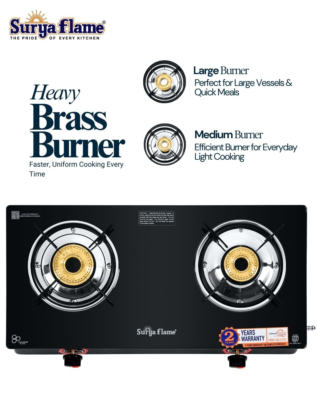 ✅ Fuel-Efficient Brass Burners: Comes with 2 rust-resistant brass burners (1 Large & 1 Medium) for consistent flame, faster cooking, and better gas savings.