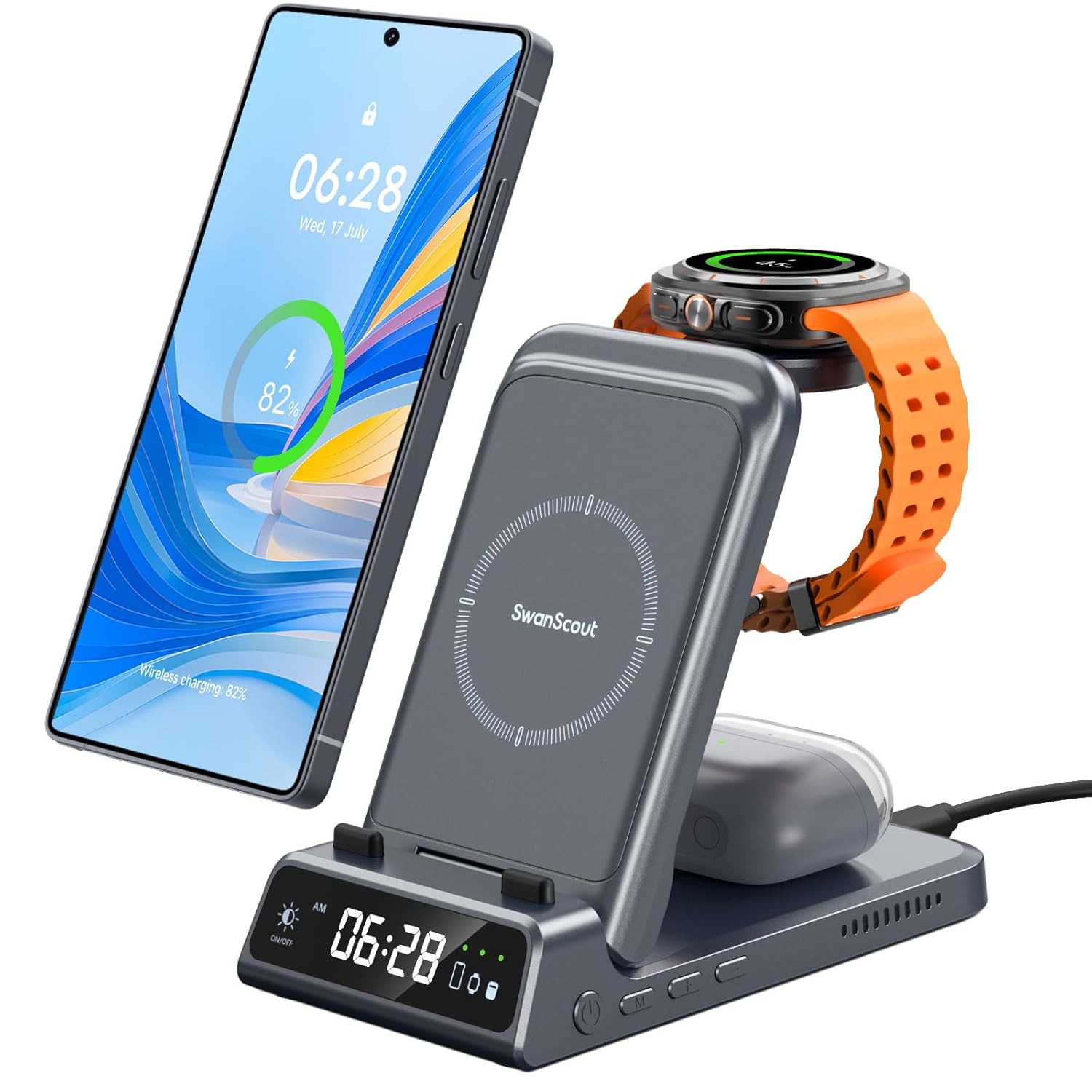 3-in-1 Design Simplifies Your Life: Charge your phone, Galaxy Watch, and headphones in one place, eliminating messy cables and keeping your space organized and efficient. Note: For optimal charging, use an 18W or higher adapter