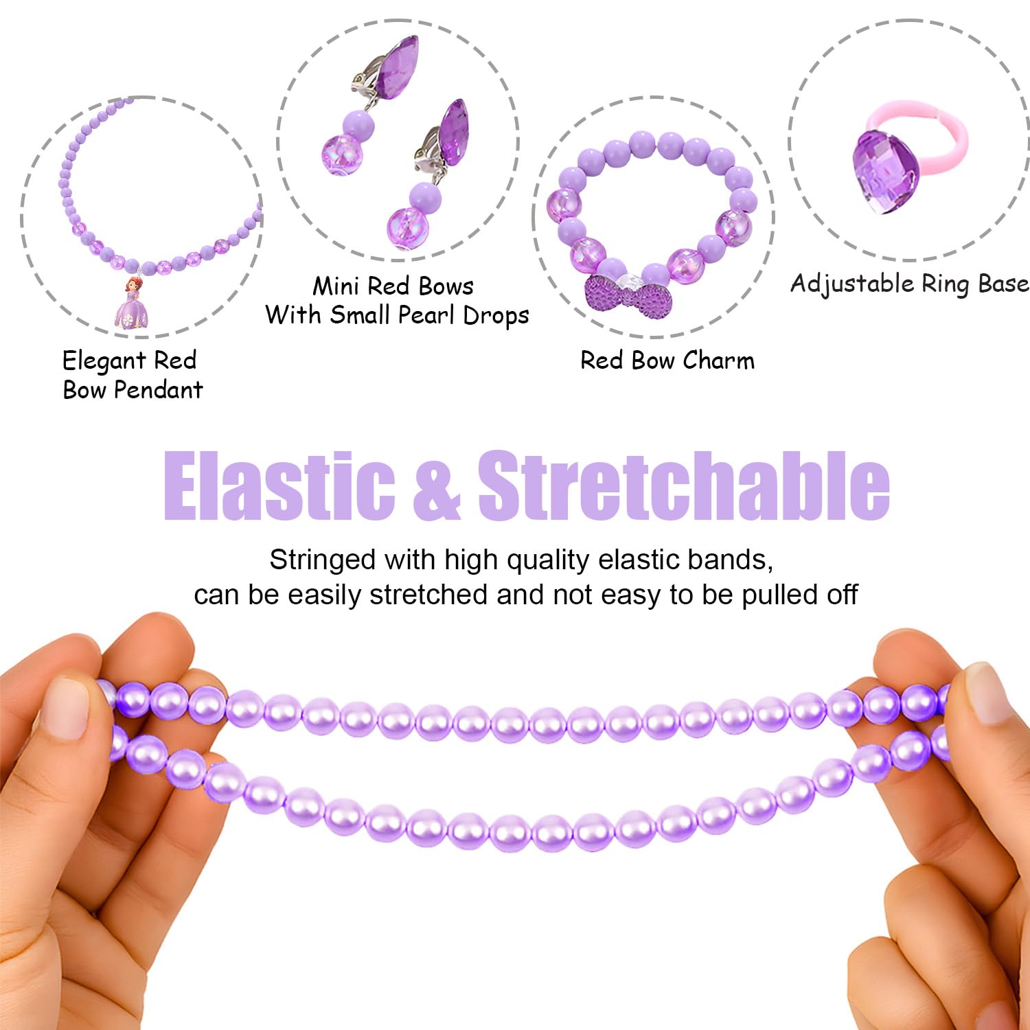 SYGA Children’s Cartoon Necklace Spot Jewelry Beads Necklace Bracelet Ring Earrings 5Pcs Set For Kids, Girl, Gift, Party (Purple Beads)