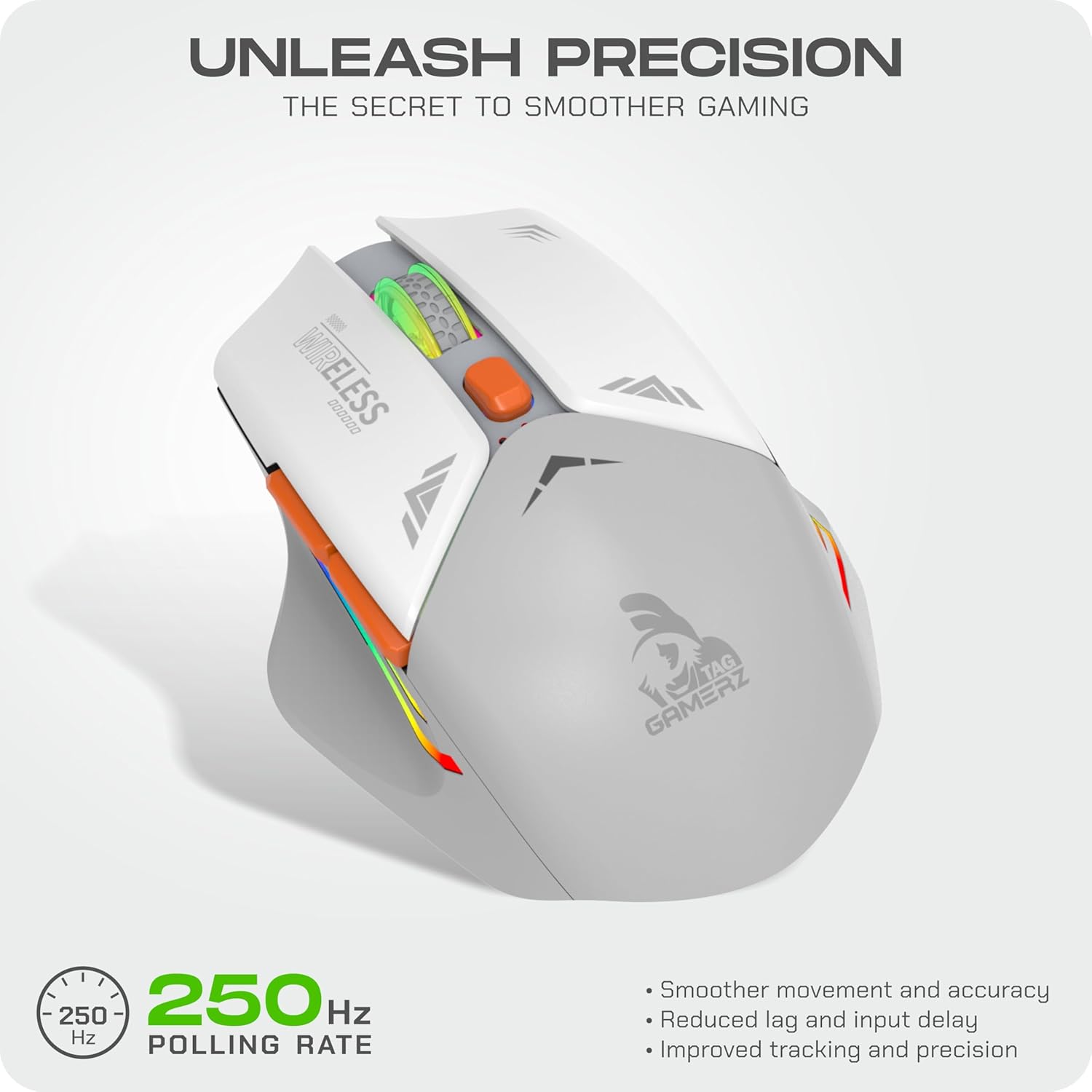 TAG Gamerz WM800 RGB Wireless USB Gaming Mouse, 6 Buttons, 2.4GHz Receiver, Rechargeable Battery, Type-C Charging, 10m Range, Adjustable DPI, Plug and Play, for Windows/MAC/Linux/PC/Laptop (White)