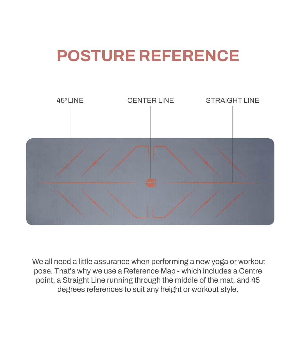Posture Reference for Better Alignment: References points with center point, midline, and angled guides – helps you stay aligned and confident through every pose