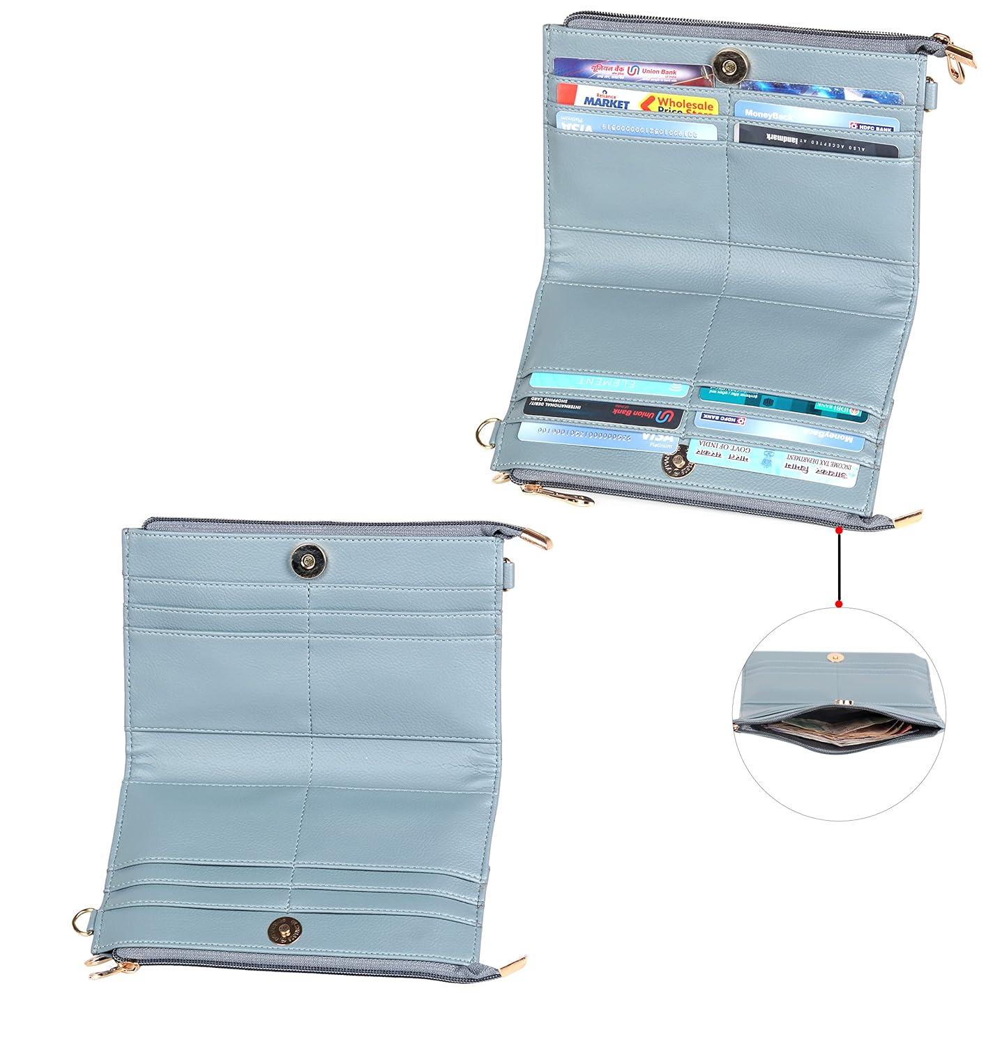 CONVENIENT DESIGN: This wallet has been provided with two main cash compartments to hold your cash, coins etc. Twelve card slots for placing your credit, debit cards. This wallet has a snap closure to protect all your valuables. Also provided with a front zip pocket for holding your mobile etc. It is designed in a compact and slim size which makes it easier for carrying during travel. Adjustable and detachable shoulder strap for carrying it as sling bag.