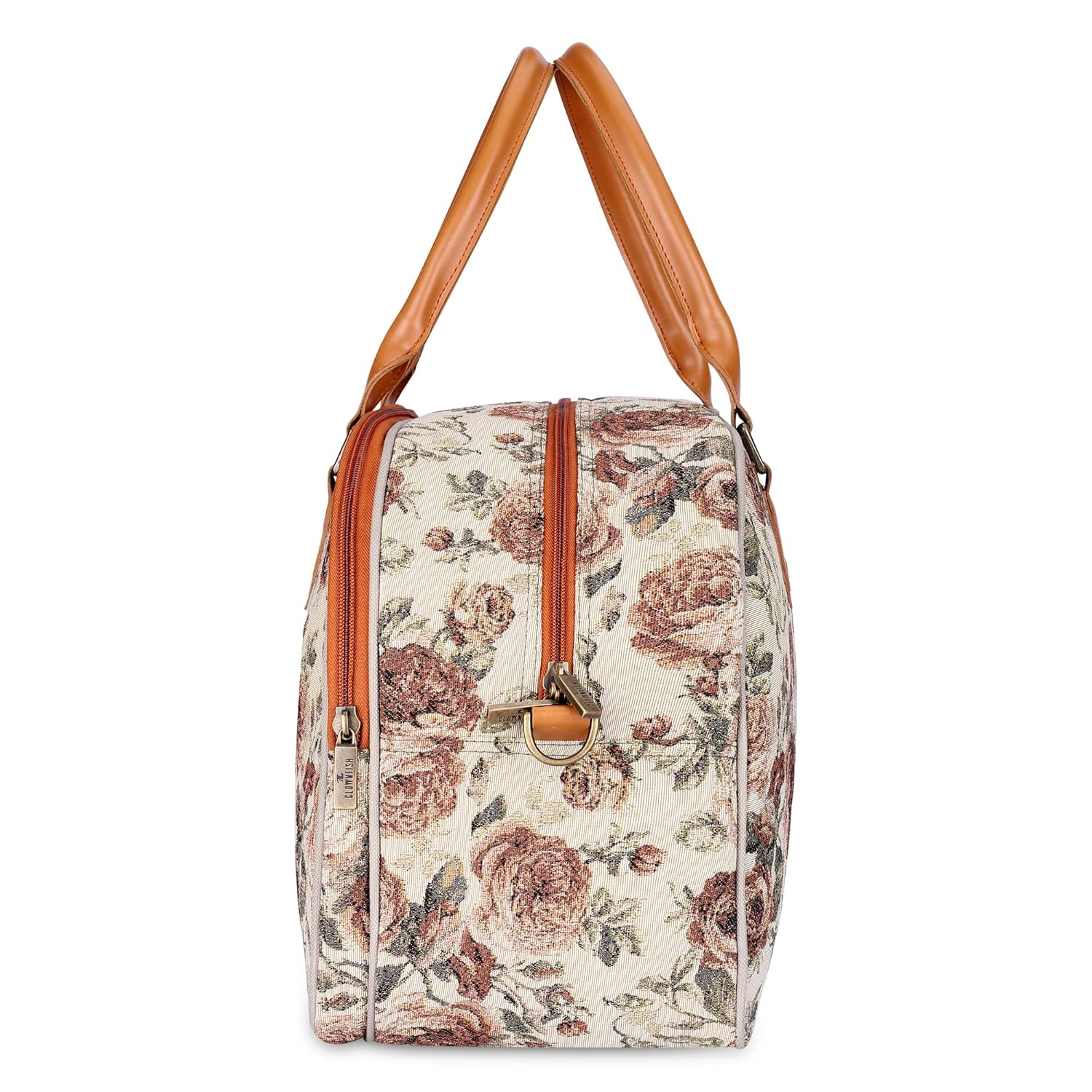 PREMIUM MATERIAL: This stylish duffel bag is made from combination of Tapestry & Faux leather. For the inner lining soft feel polyester fabric is used.