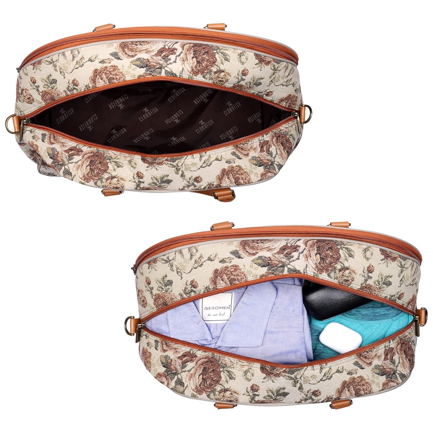 PREMIUM MATERIAL: This stylish duffel bag is made from combination of Tapestry & Faux leather. For the inner lining soft feel polyester fabric is used.