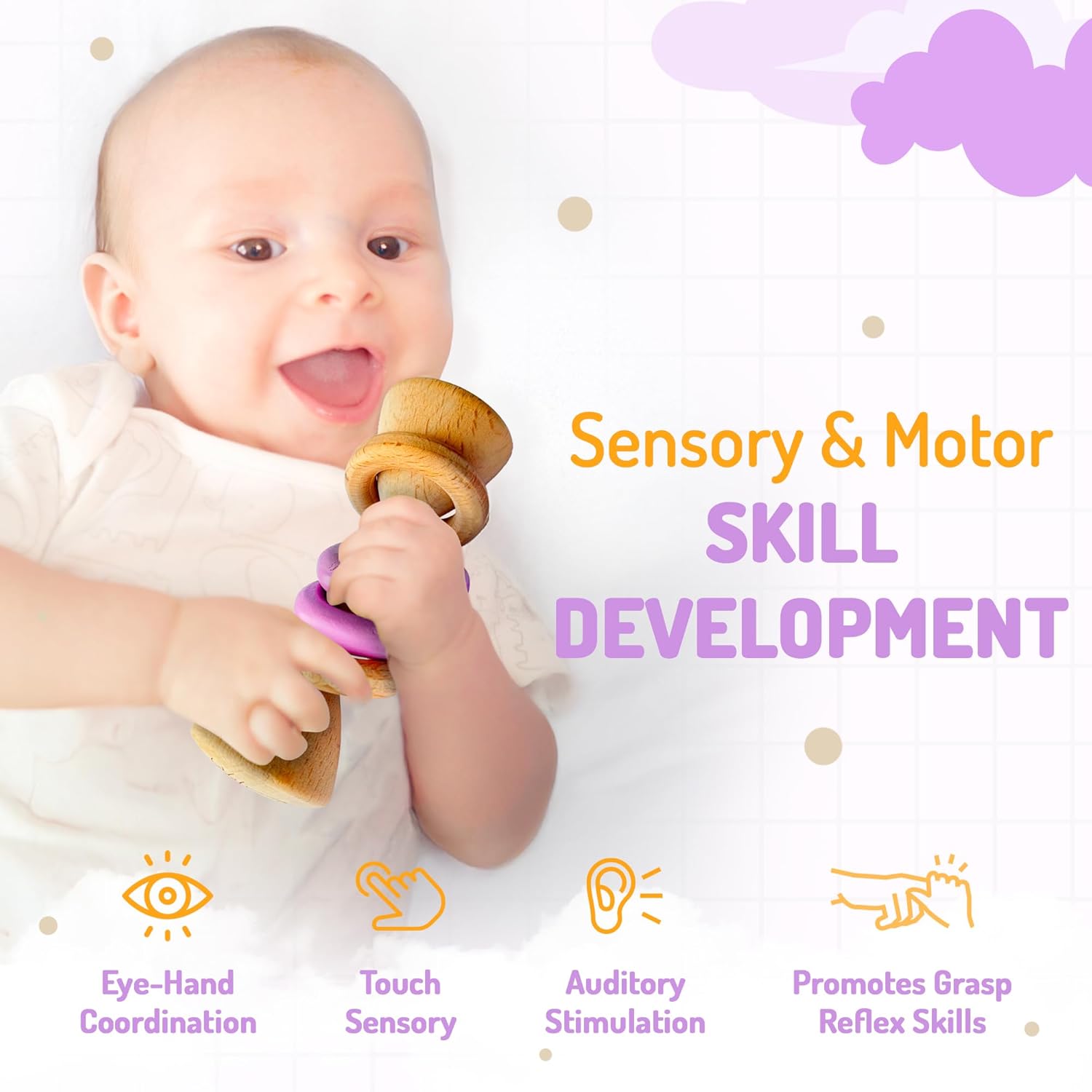 ☁️ Promotes Early Sensory Skills: The soft rattling sound and wooden textures engage your baby’s touch, hearing, and motor skills—encouraging brain development from day one.
