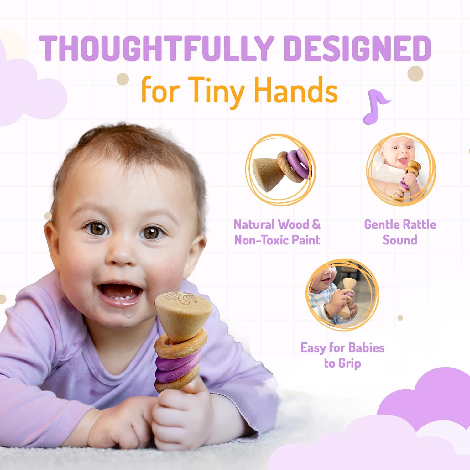 🌿 Natural Sound Toys for Babies: Made from smooth, non-toxic wood and colored with baby-safe paints, this rattle doubles as one of the safest toys for babies during early development.