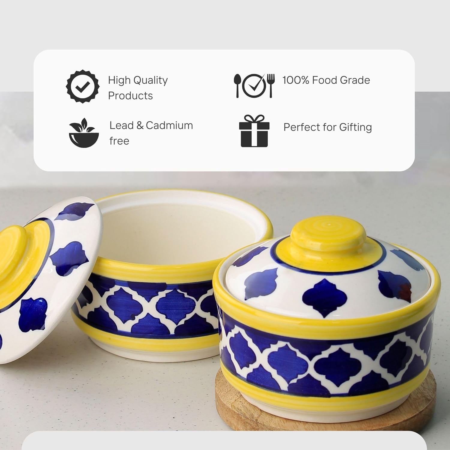 Add a vibrant touch to your dining experience with The Earth Store Moroccan Yellow and Blue Multipurpose Ceramic Donga Set of 2. These stunning 500 ML serving bowls feature an eye-catching Moroccan-inspired design, combining elegance with everyday practicality. Ideal for serving a variety of dishes such as snacks, vegetables, rice, dal, and pasta, this donga set is perfect for daily use, festive gatherings, or as a thoughtful gift. Crafted from premium ceramic, the bowls are lightweight, durable, and equipped with leak-proof lids for added convenience. Both microwave and dishwasher safe.