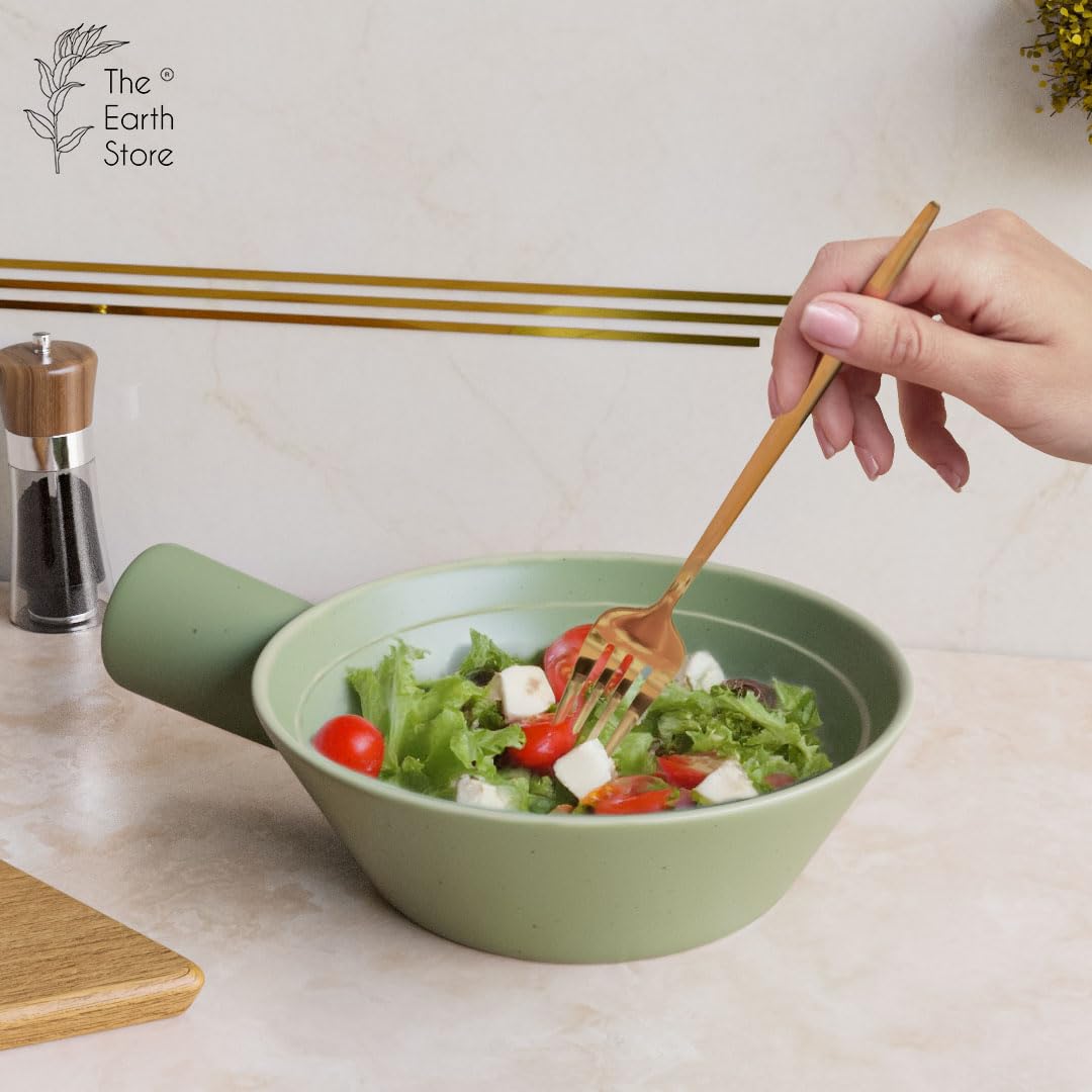 Add a touch of sophistication to your dining and serving experience with The Earth Store Olive Green Ceramic Serving Bowl with Handle. This versatile bowl, with a generous capacity of 550 ML, is perfect for serving a variety of dishes, from snacks and appetizers to hearty soups. The stylish Olive Green color complements any table setting, while the convenient handle provides ease of use and adds a unique touch. Made from high-quality ceramic, this bowl is both durable and aesthetically pleasing, ensuring it withstands the rigors of daily use. Easy to clean and dishwasher safe, this serving bowl combines style with practicality, making it an essential addition to your kitchenware collection.