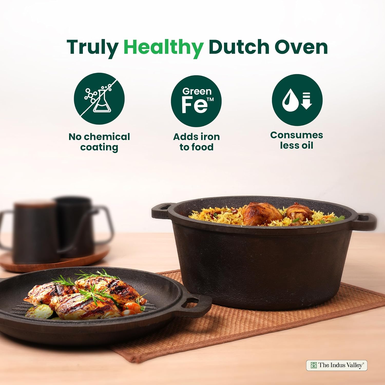Cast Iron cookware from The Indus valley is made up of strong iron material which helps them to stay tough and hard for a long time. Cast Iron cookware is hard and strong and is capable of bearing high heat. Hence it’s durable and lasts for a very long time. Indian cuisines mostly involve slow-cooking methods. So it’s perfect for slow cooking meals.