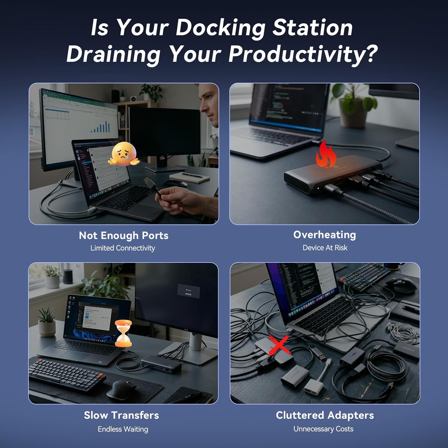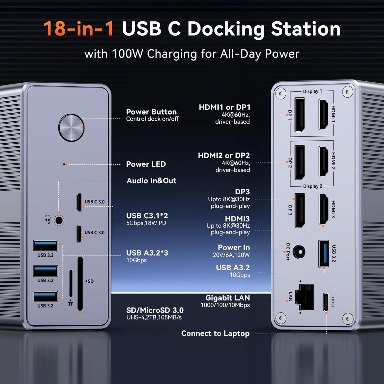 TobenONE’s USB C triple monitor docking station streamlines your connectivity needs by providing up to 18 ports