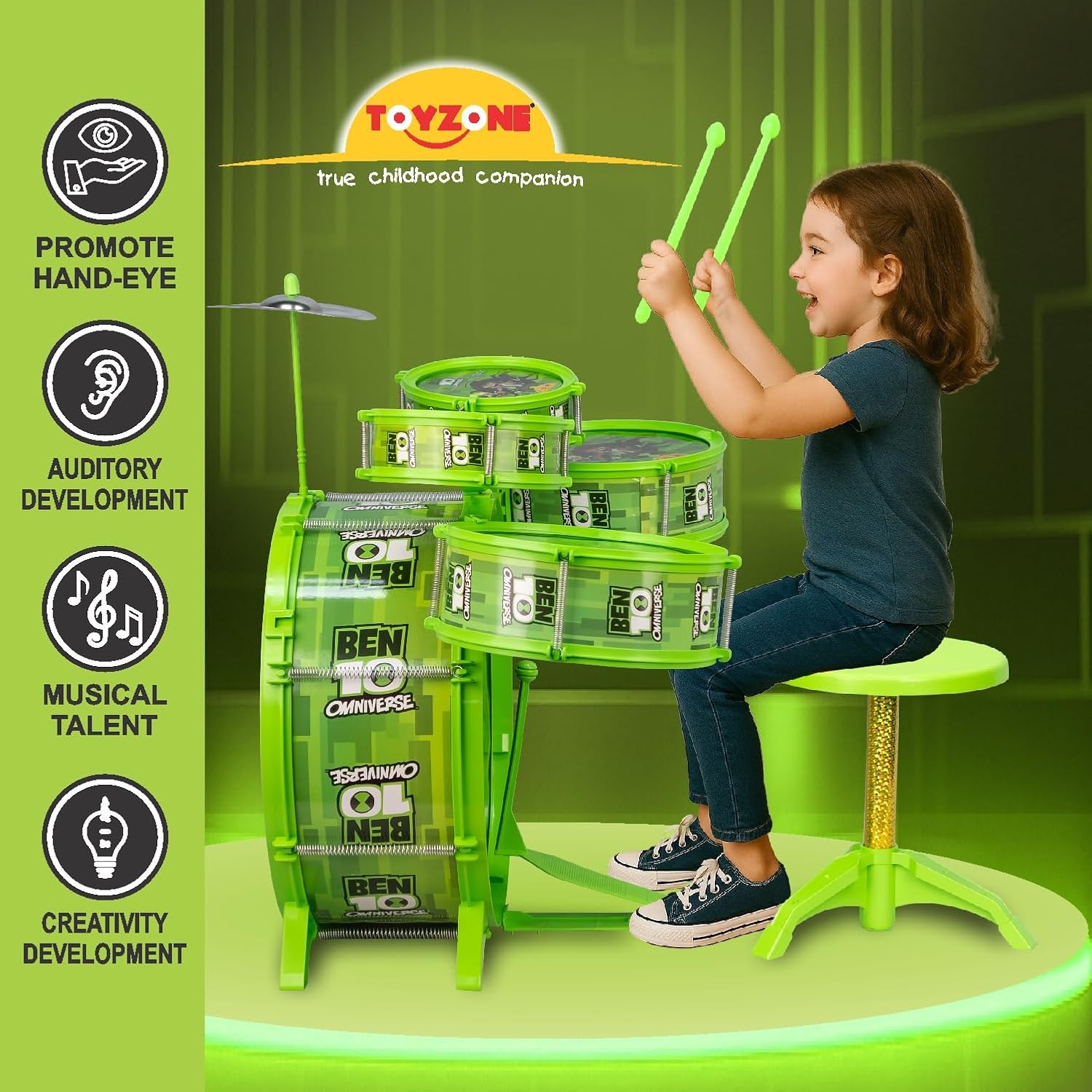 Complete Set – Includes 1 alloy cymbal, 2 small drums, 2 medium drums, 1 big drum with pedal, 2 drumsticks, and 1 child-sized stool for a full and realistic drumming experience.