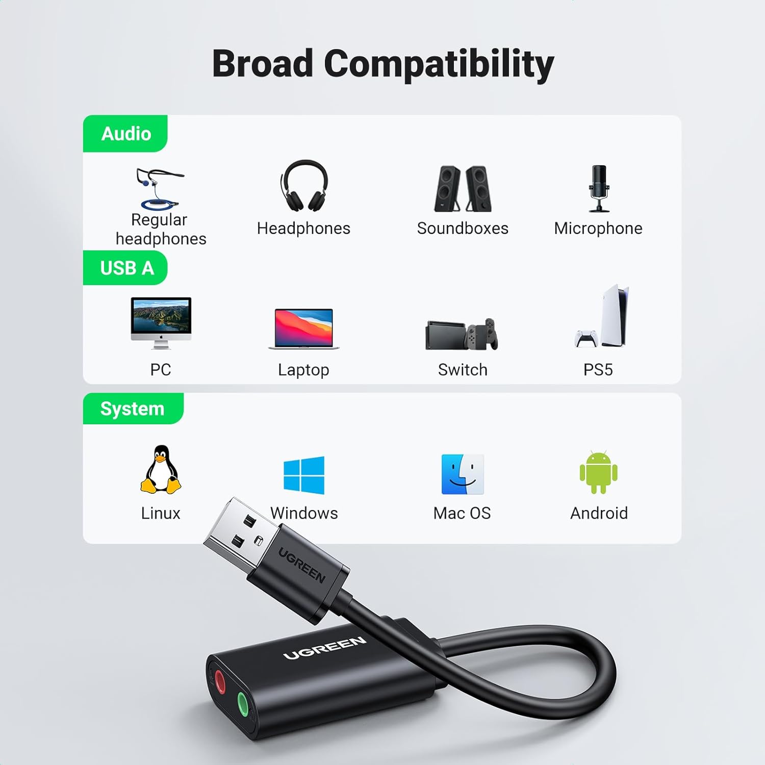 UGREEN Aux to USB adapter offers an easy and portable way to upgrade the sound quality of your favorite laptop or desktop computer. This USB to audio jack gives you easy access to a wide selection of audio input and output ports so you can plug in a microphone, a gaming headset, or speakers. You could even use the external sound card to plug in a home theater sound system or to assist in recording music or podcasts.