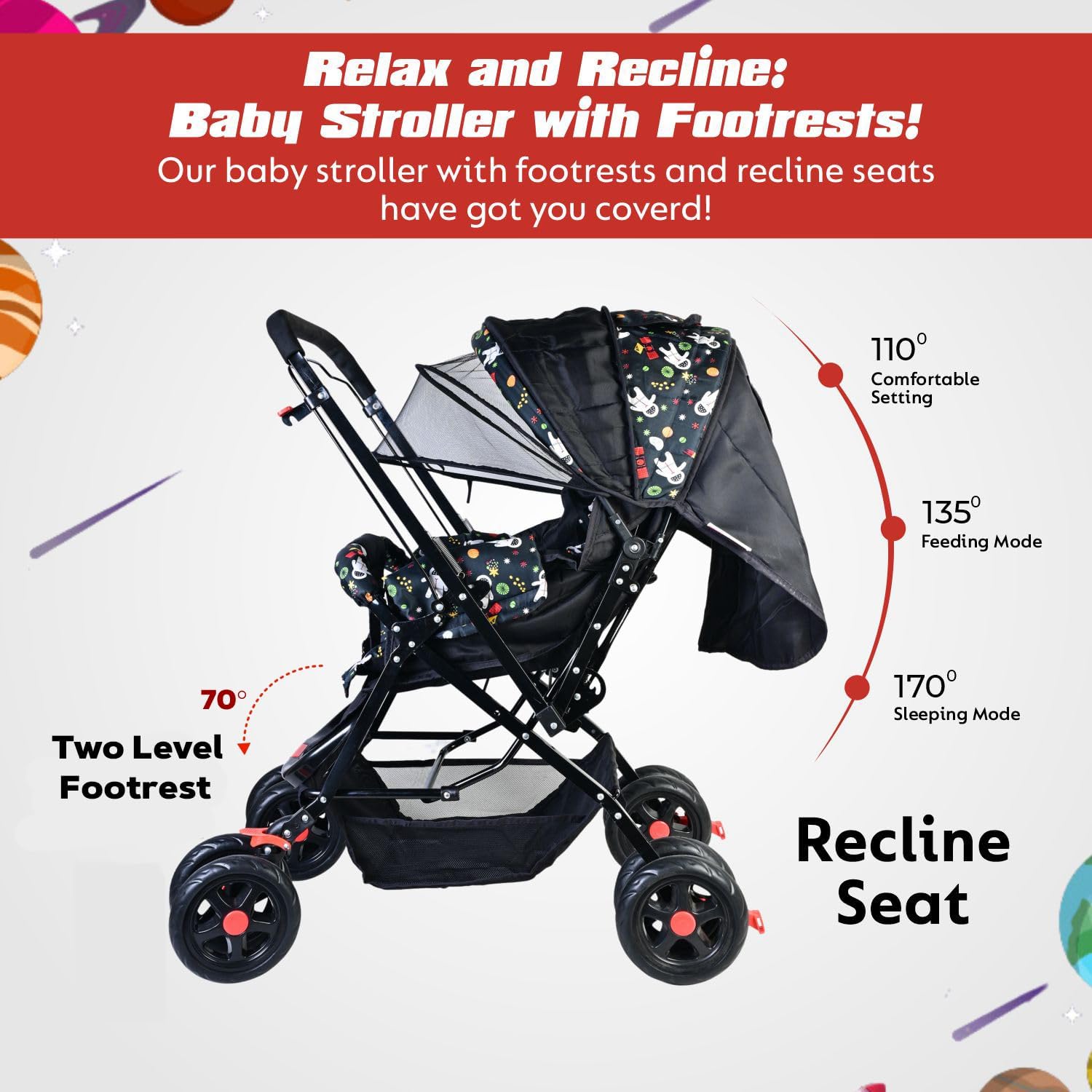 Comfort Ensured : 3 position Seat recline so that baby can sit, relax or sleep inside the stroller. Cushioned seat, Adjustable footrest & Wheel Suspension adds to baby’s comfort.