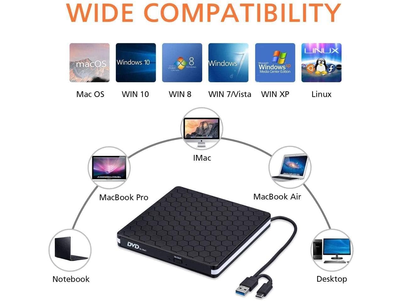 【External CD/DVD Drive】 This portable cd player is ideal for various devices, compatible with Windows XP/7/8/10/11/, Linux, all versions Mak OS systems. For the desktops, please connect the dvd player for laptop to the back USB port of the motherboard for normal use