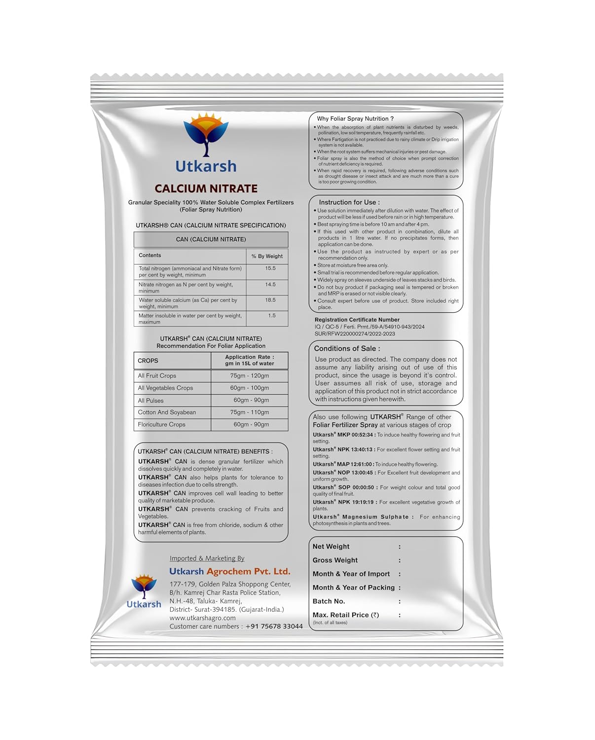 Utkarsh Calcium Nitrate is a COMPLIANT PRODUCT as per Fertilizer Control Order (FCO) 1985 under Schedule 1(i) containing water soluble Calcium(as Ca) 18.5% minimum and Total nitrogen (Ammoniacal and Nitrate form) 15.5% minimum.