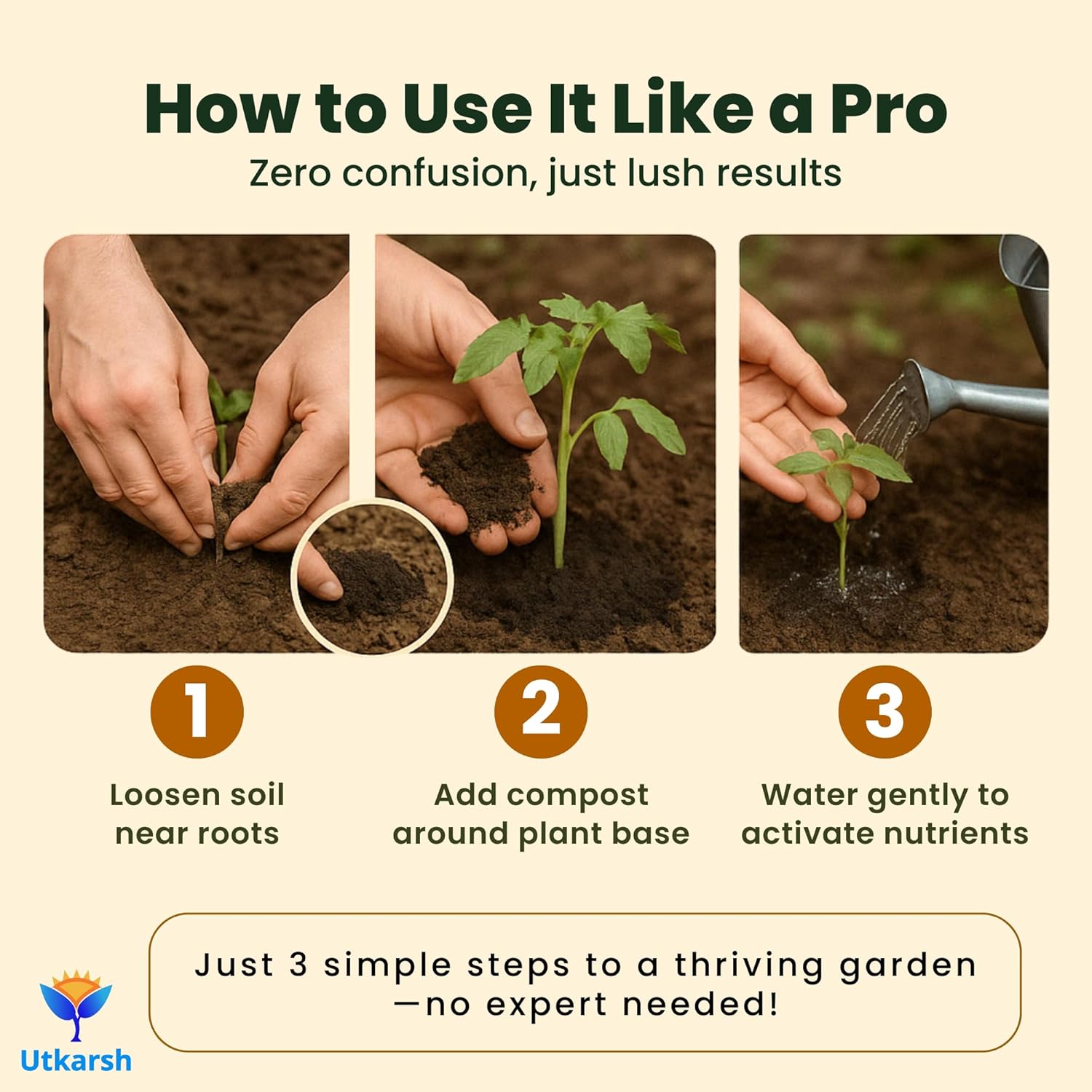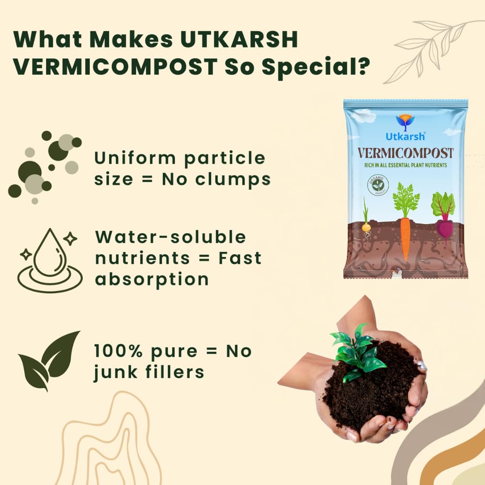 Doses: Potted Plants: 100 gram per plant (12-inch pot) | Field Crops: 1 tonne per acre. | Horticulture Crops: 2-5 kg per plant (based on plant age). Direction of use: You can use Utkarsh Vermicompost either alone or in combination with other potting materials like Utkarsh Perlite, Vermiculite, Cocopeat, Neem Cake, Castor Cake, Bio Compost, Manure Granules, etc.