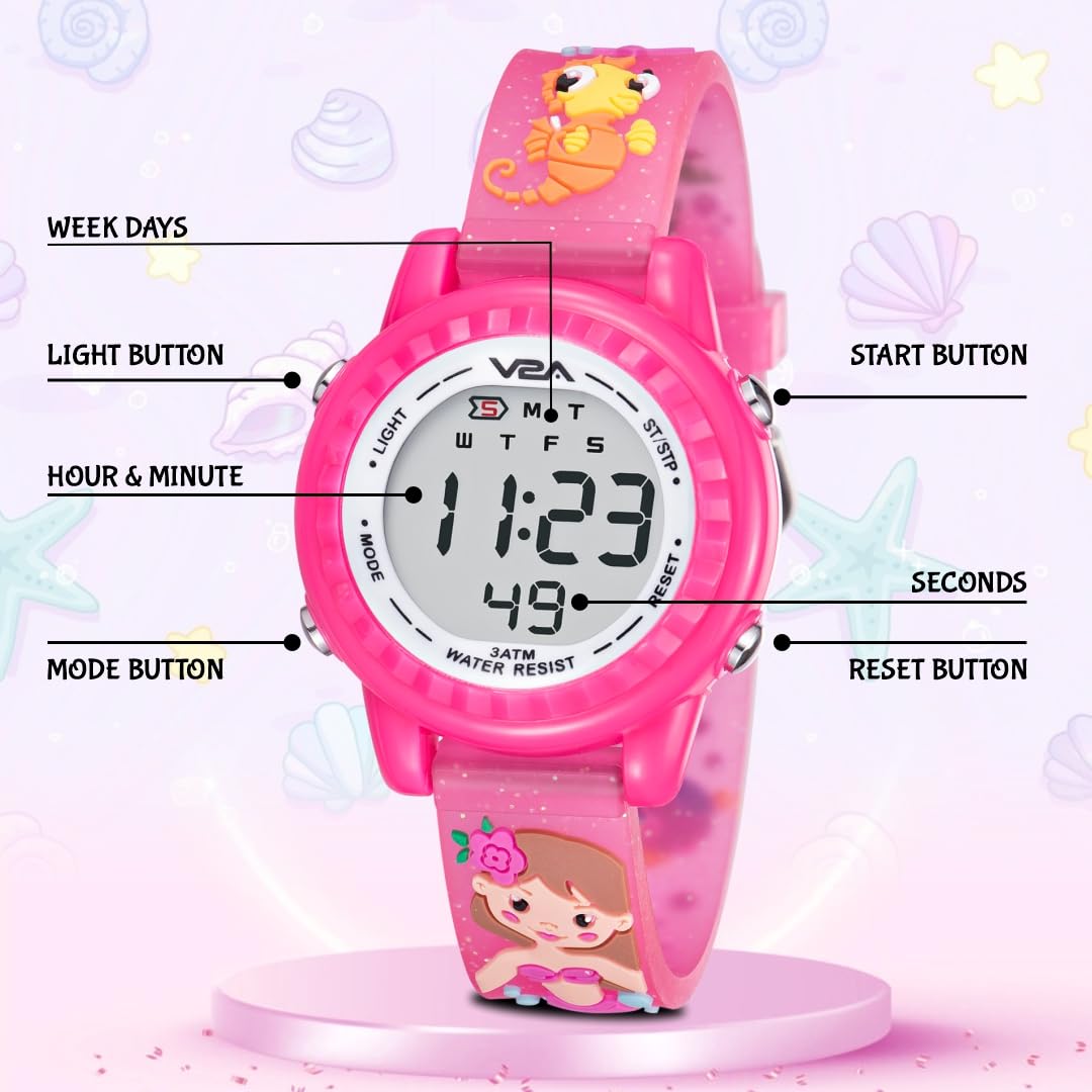 V2A Magic Series 3 to 8 Years Girls Digital Watch – 3D Mermaid Theme, Soft Silicone Strap, Multicolour LED Light, Alarm, Stopwatch, 30 M Waterproof| Birthday Return Gift