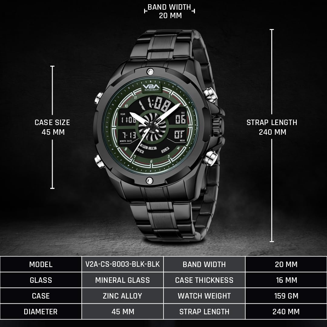 V2A Torque Series Analog-Digital Metal Watch for Men Black Stainless Steel Band Green Dial| Chronograph| Dual Display | Waterproof|Stylish| CS-8003