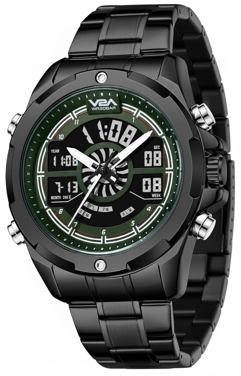 V2A Torque Series Analog-Digital Metal Watch for Men Black Stainless Steel Band Green Dial| Chronograph| Dual Display | Waterproof|Stylish| CS-8003